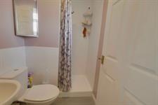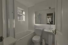 Tiled step in shower, dual flush toilet, sink with mixer tap, obscured window to the rear, radiator.