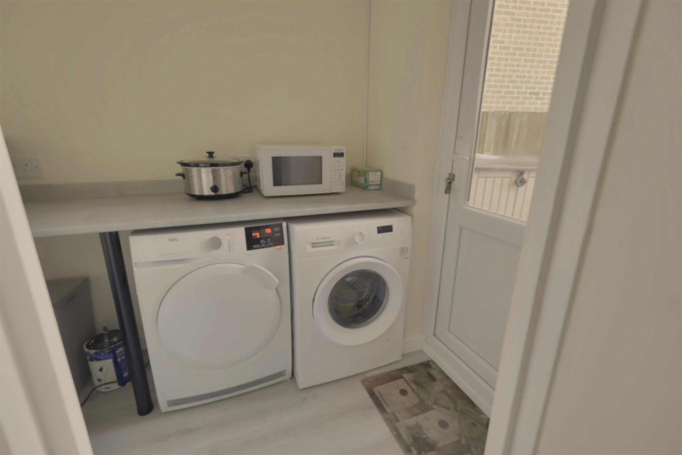 Space and plumbing for a washing machine and tumble dryer, space for an upright fridge/freezer, rolled edge work surface with access to multiple power points, patio door to the rear garden.
