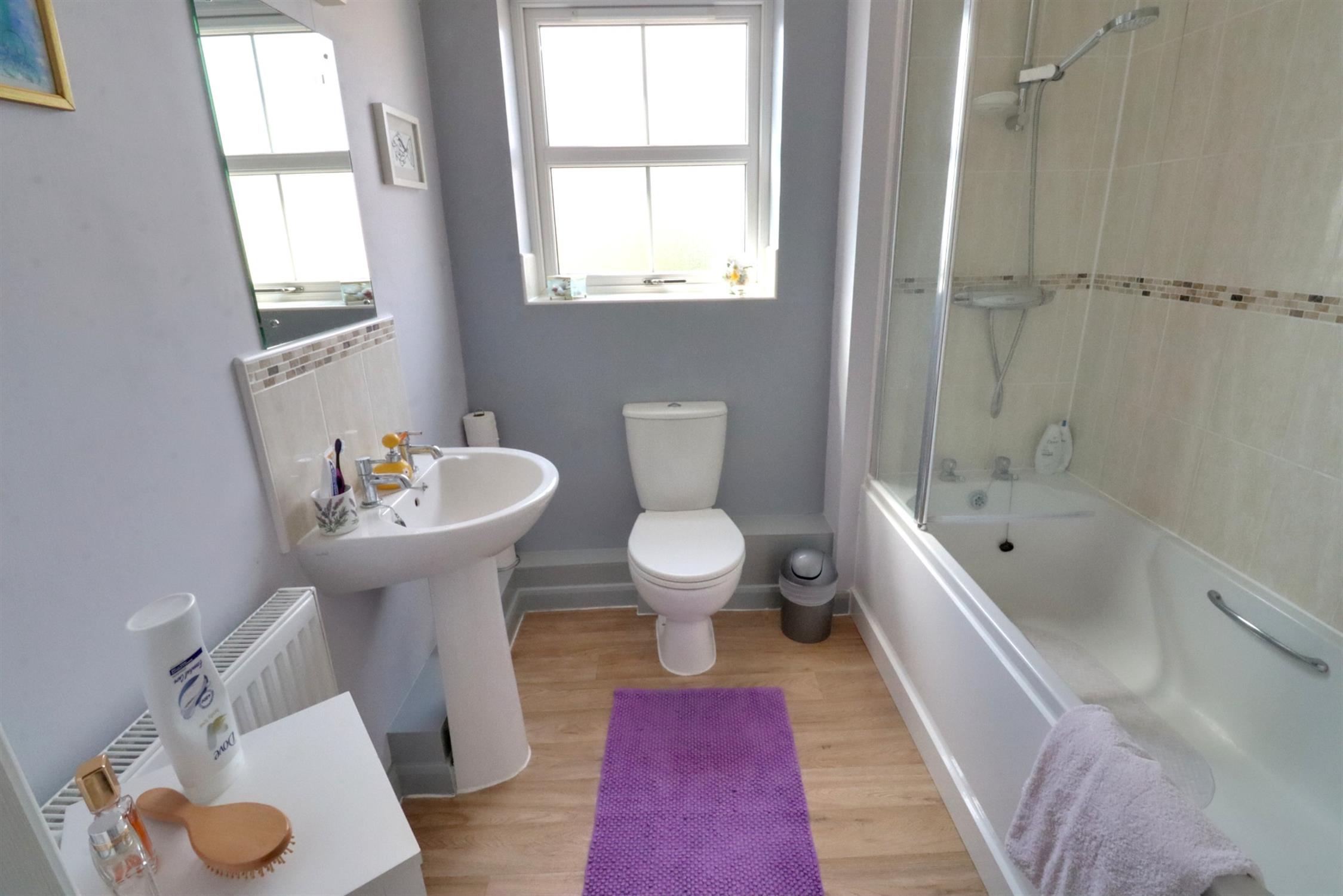 Opaque double glazed window to rear, smooth skimmed ceiling, ceiling extractor, radiator, matching white suite comprising panel enclosed bath with shower screen and shower over, dual flush W.C, pedestal wash hand basin, tiled splash backs, light and shaver point.