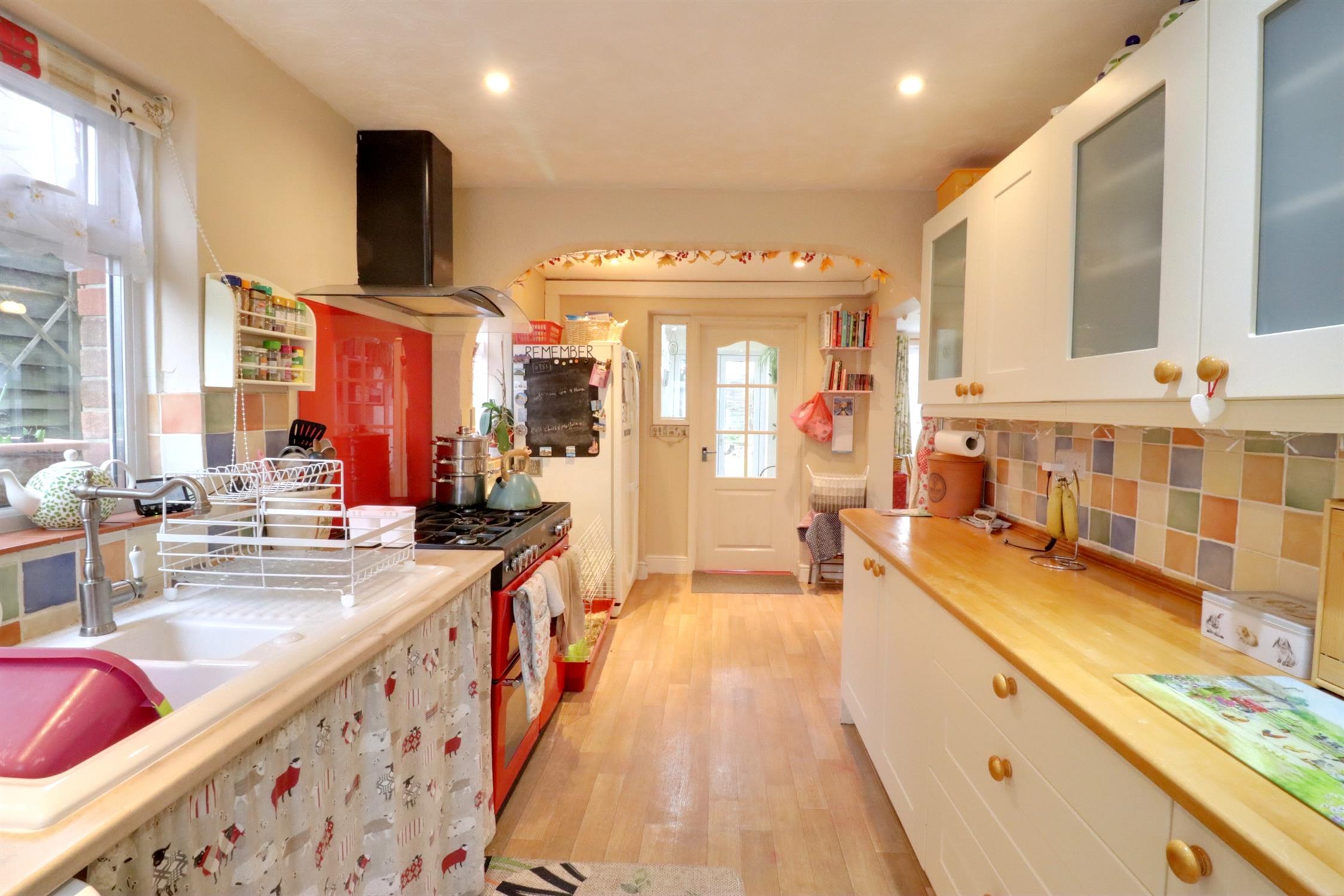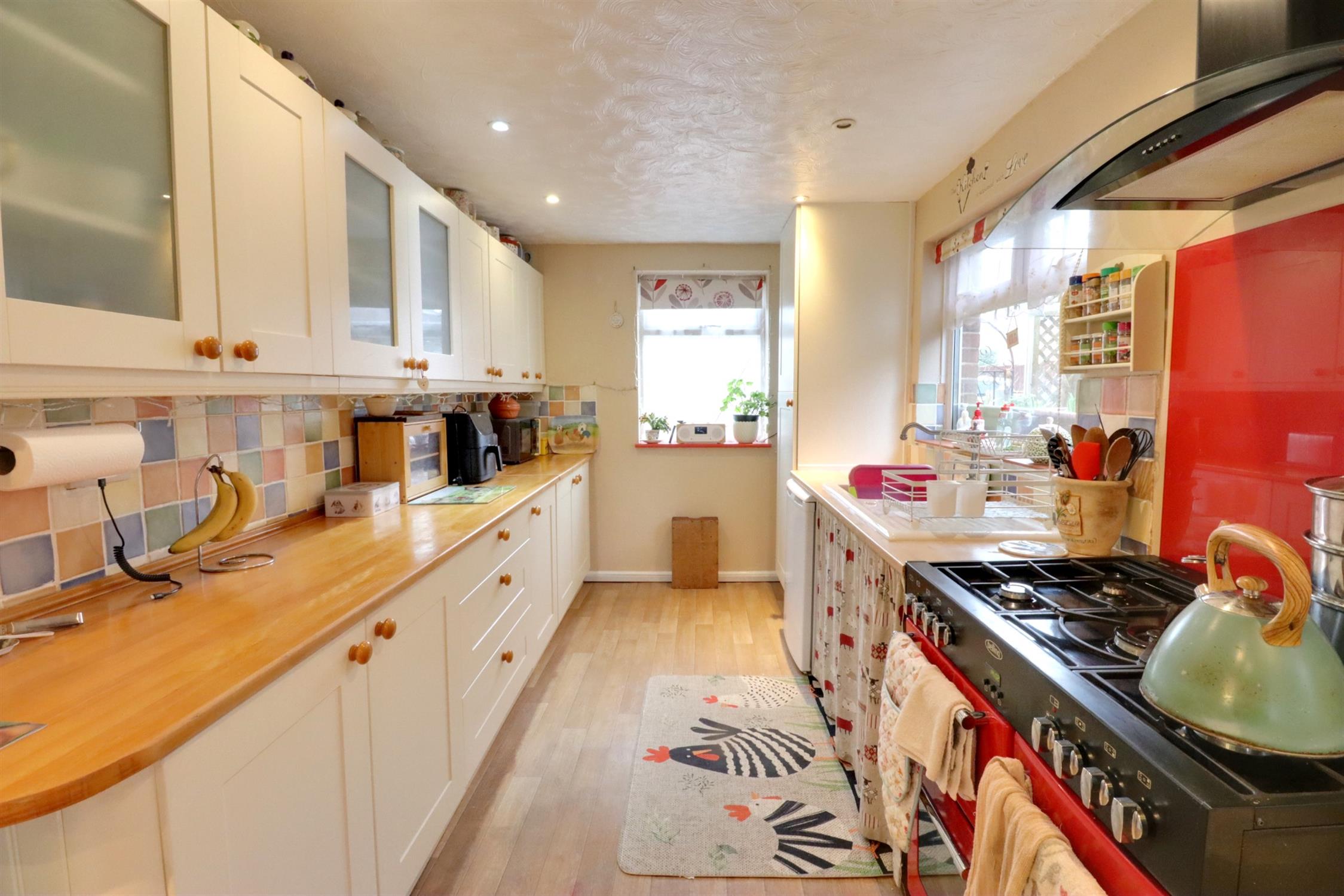 Fitted with a range of wall and base units with worksurfaces over, space for range cooker, inset one and a half bowl sink unit with drainer, radiator, front aspect double glazed window, two side aspect double glazed windows, cupboard housing the boiler, part glazed door to the utility room.