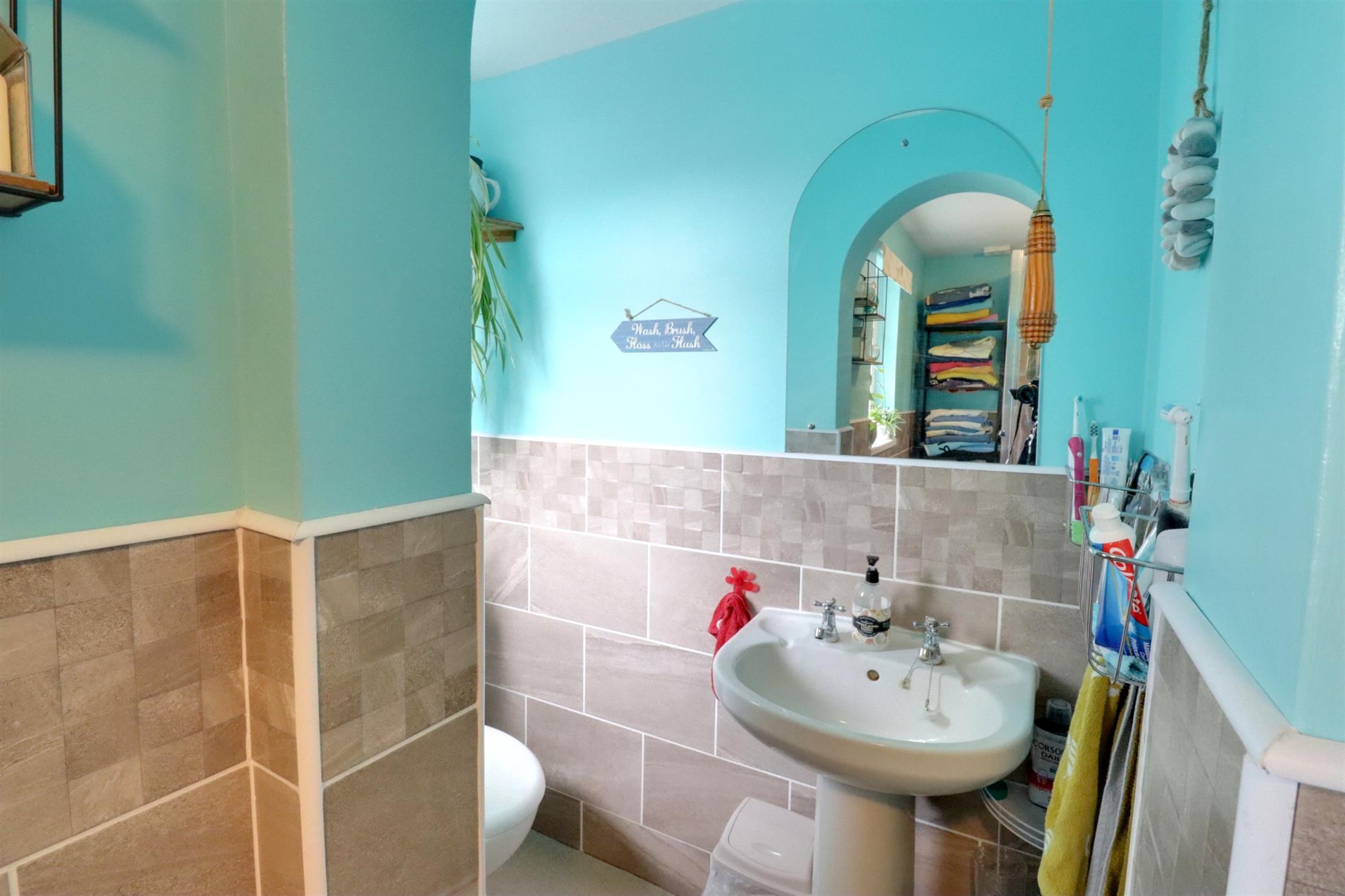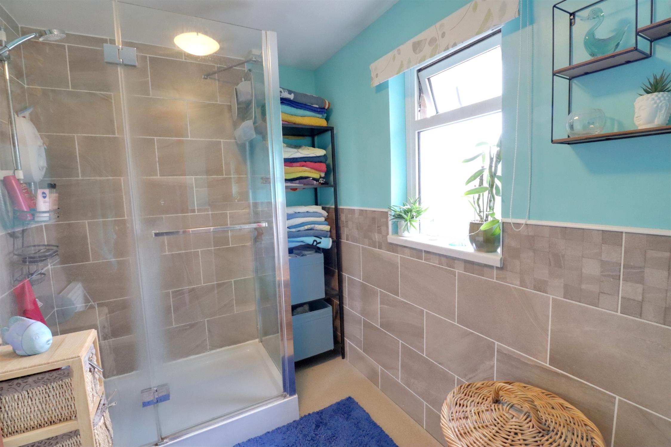 Glass shower enclosure with wall mounted electric shower, low level wc, wash basin in pedestal, radiator, rear and side aspect double glazed obscured windows.