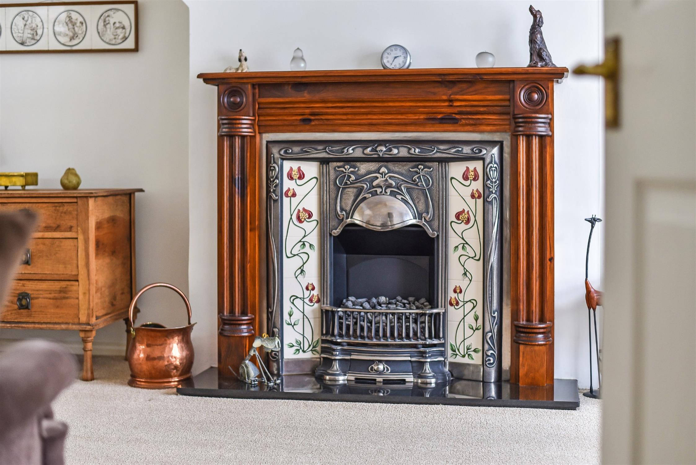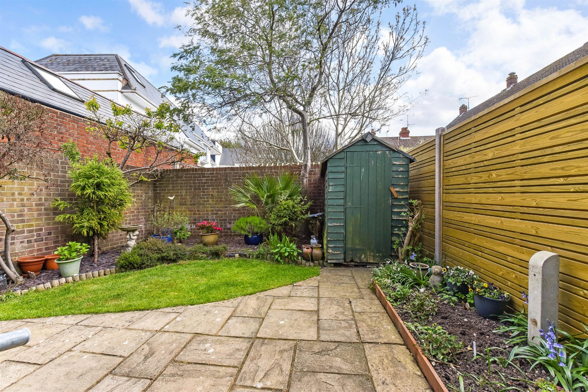 To the front, a lawned front garden with mature shrub and flower beds, mature tree, low retainer brick wall with wrought iron fence railings and gate. Side pedestrian access to the rear garden which is fence enclosed, with a patio, small lawn and mature and shrub tree borders, wooden storage shed.