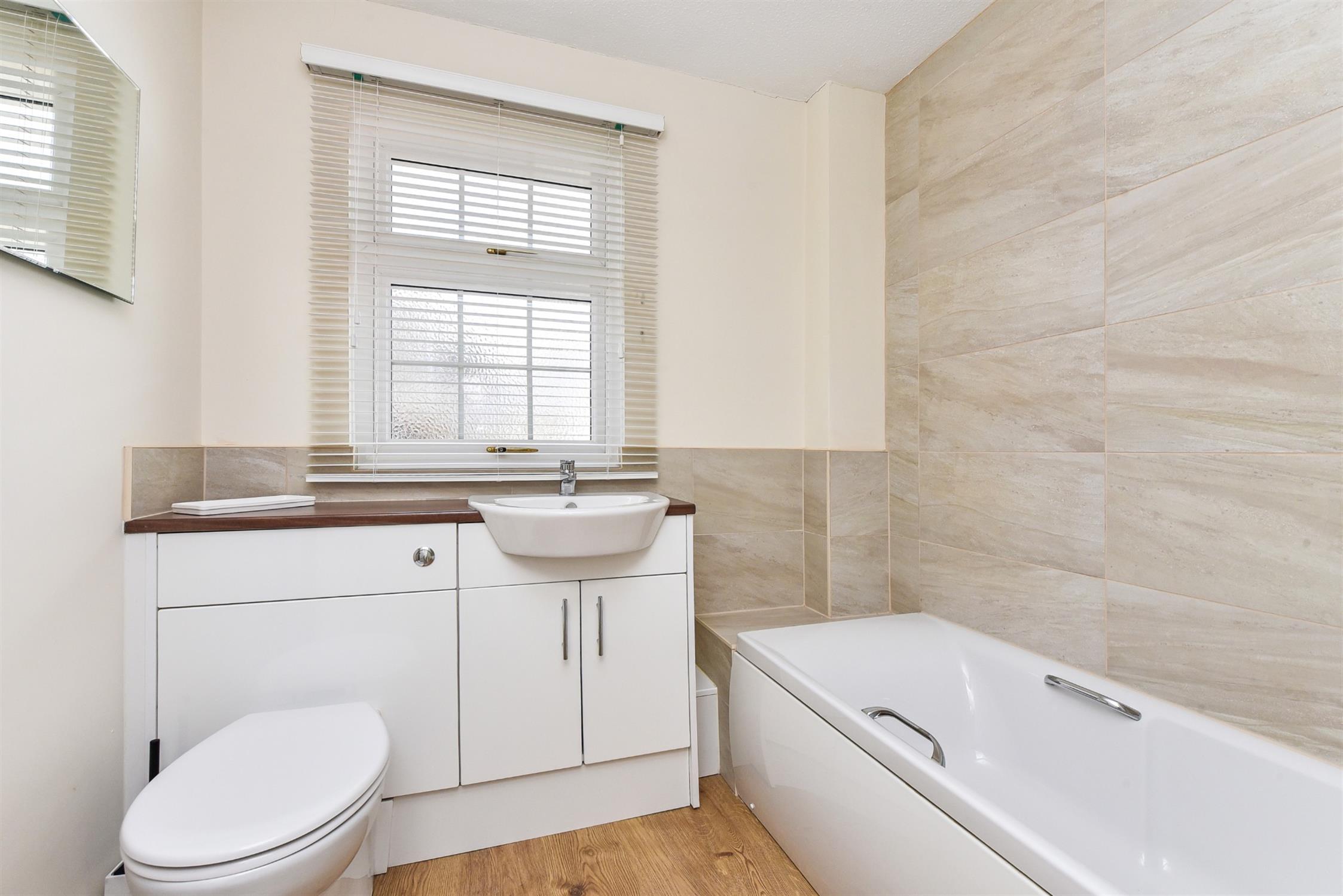 Textured and coved ceiling, inset spotlights, double glazed obscured front aspect window, panelled bath with shower over, low level WC and wash hand basin set in vanity unit, ladder radiator, part tiled walls, laminate flooring.
