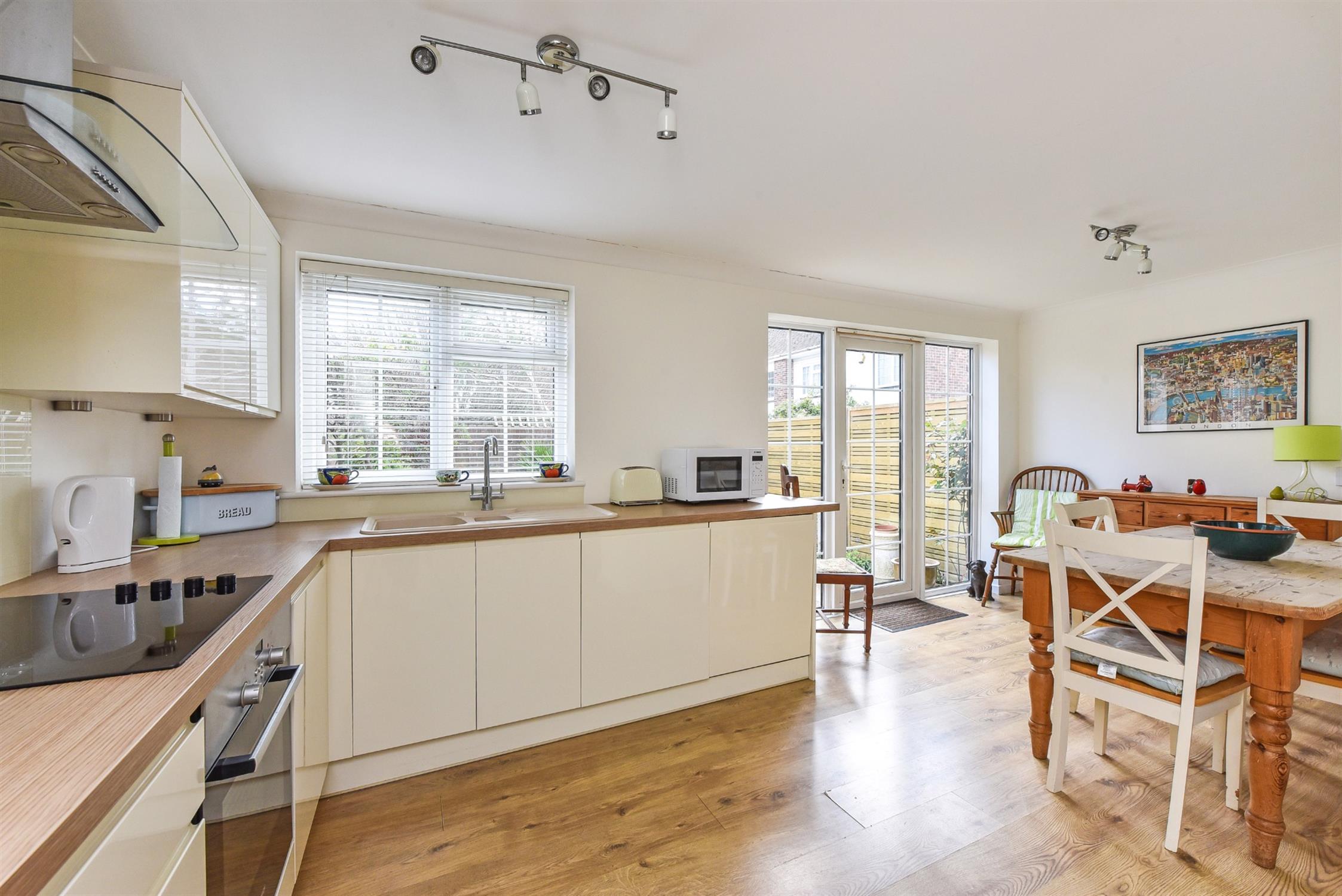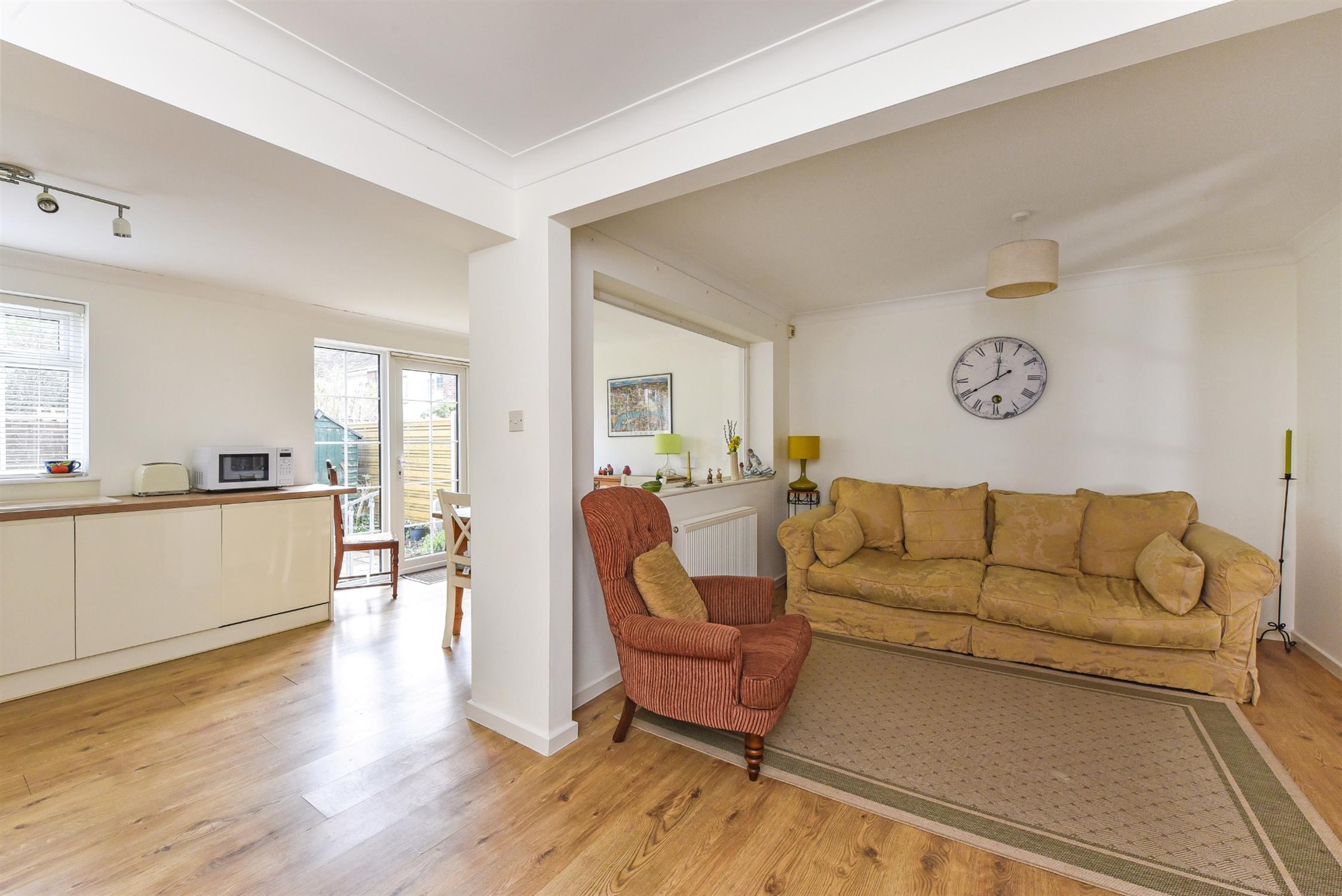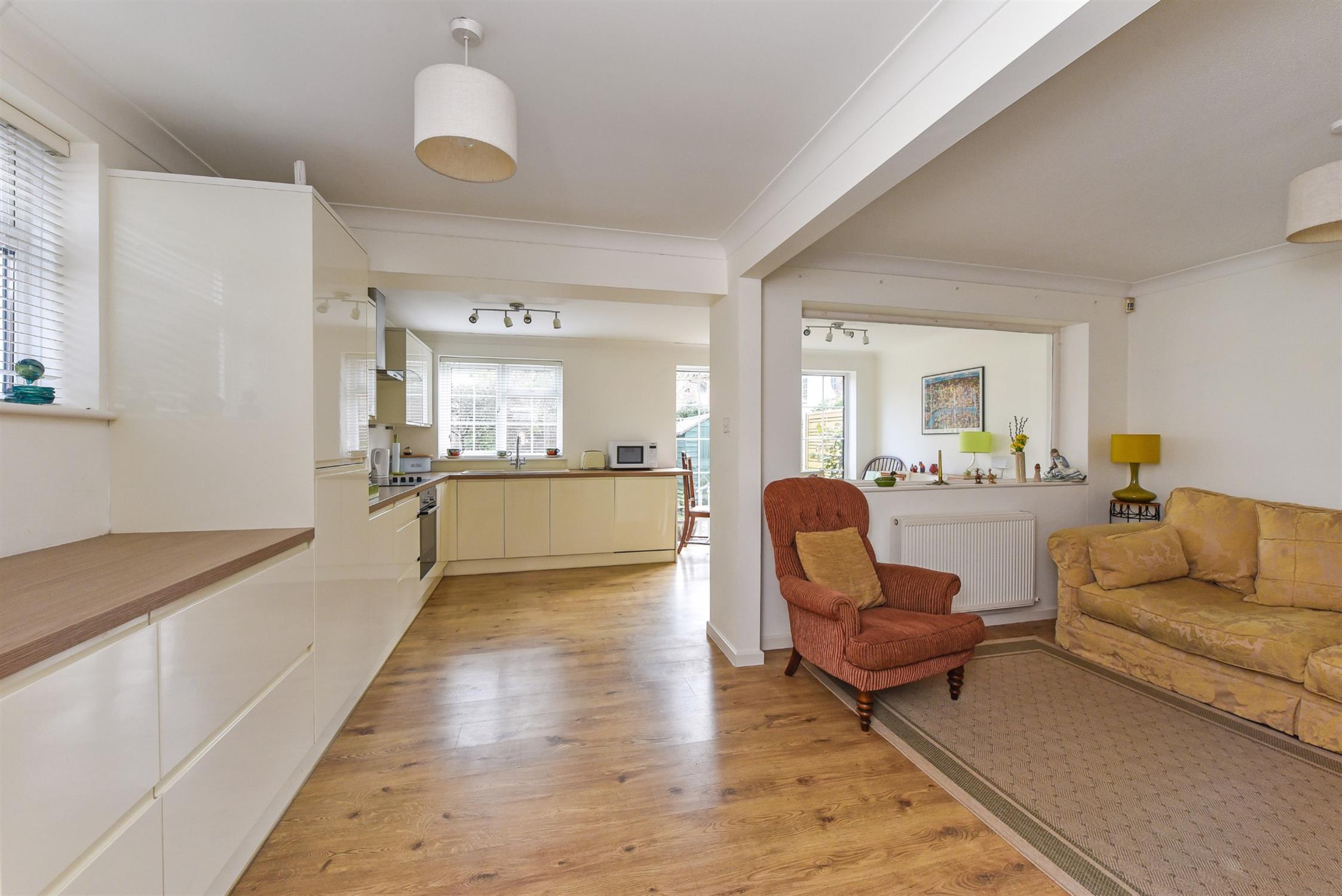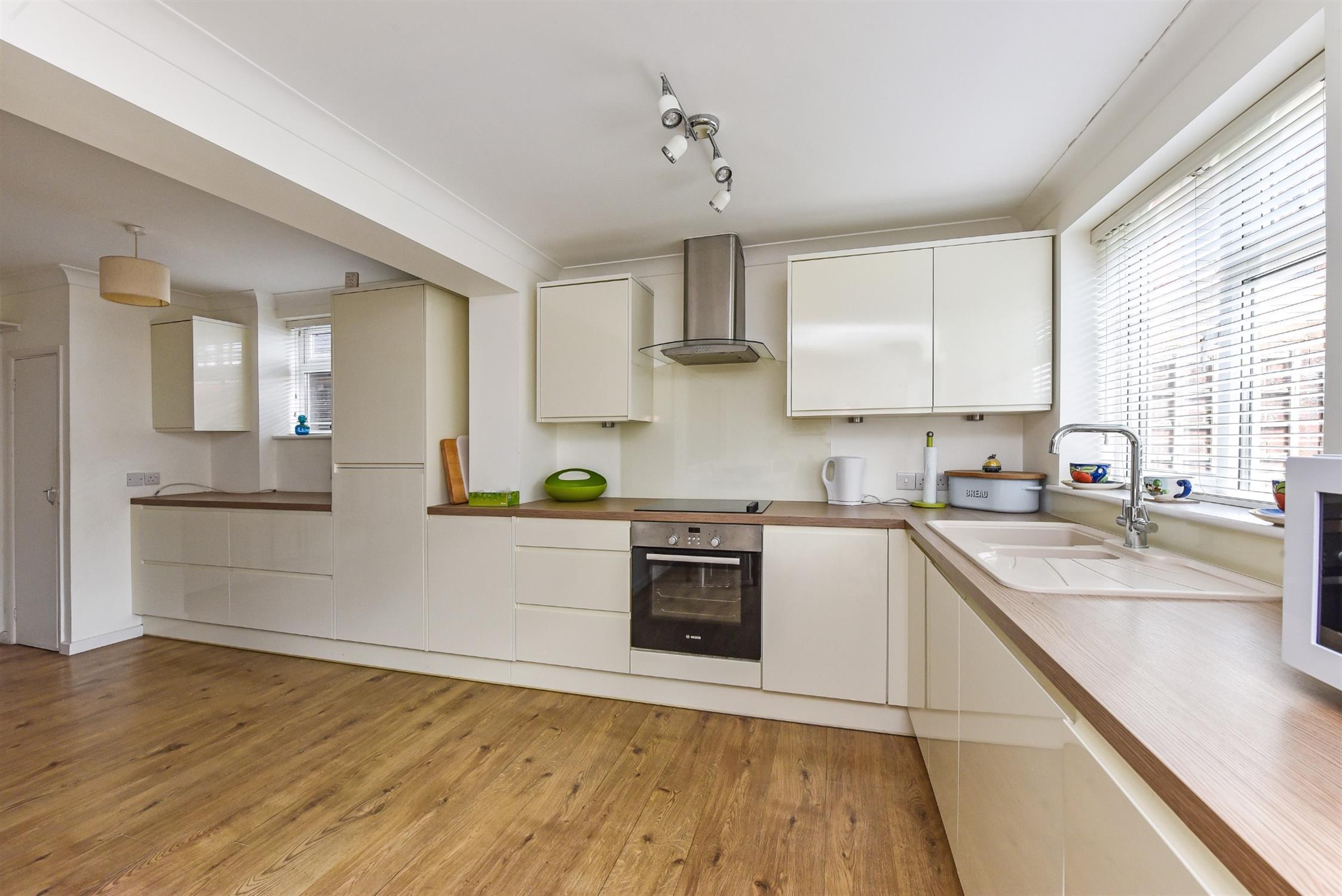 Textured ceiling, double glazed windows to side and rear aspects, double glazed double doors and side windows to rear garden, two radiators, cupboard housing gas boiler, laminate flooring. Kitchen comprising: wall and base mounted units with work surfaces over, inset sink and drainer with mixer tap over, integrated appliances including: fridge freezer, electric oven and hob with extractor fan over, dishwasher and washing machine.