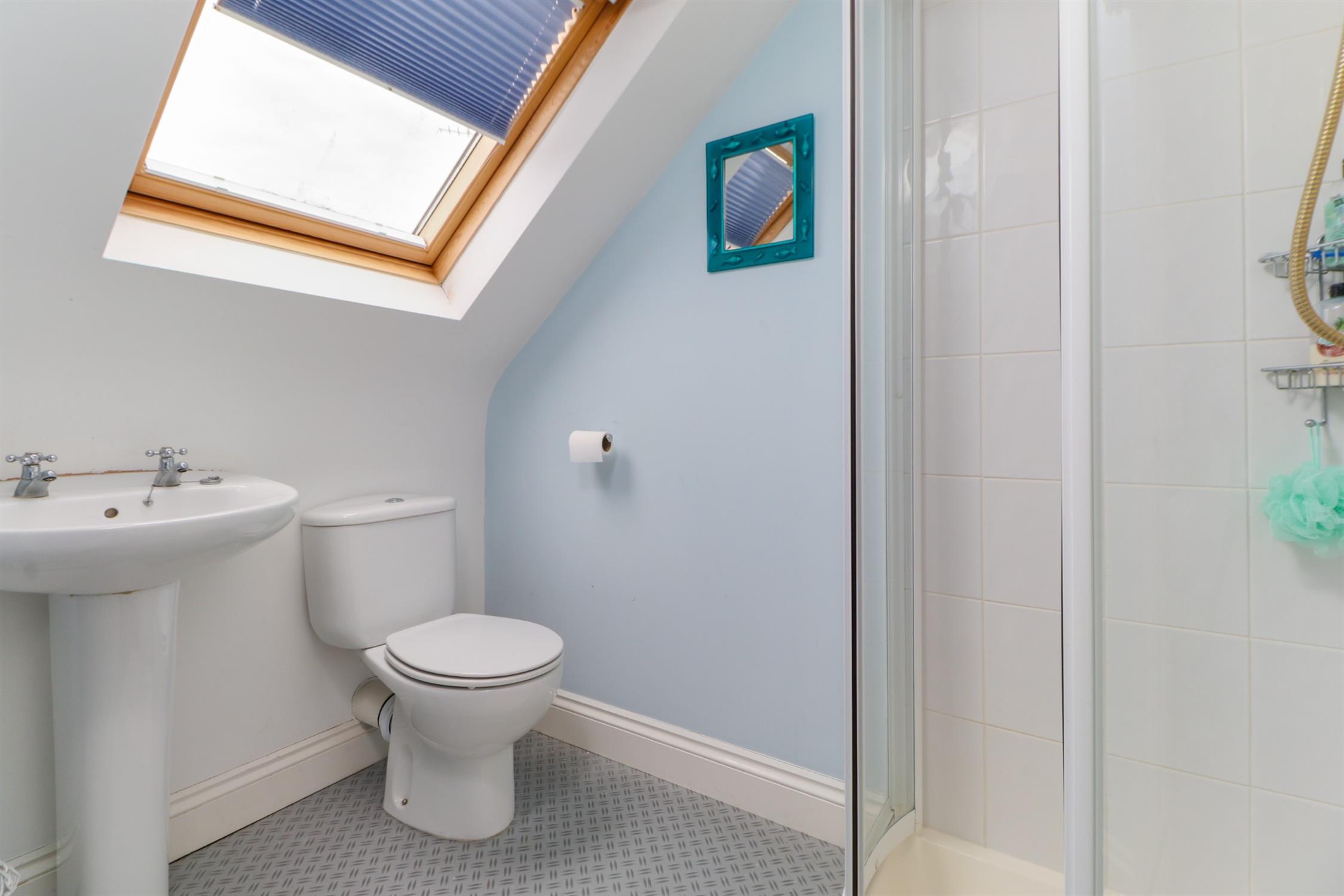 Smooth ceiling, double glazed Velux window, corner shower cubicle, low level WC, pedestal wash hand basin, ladder radiator, vinyl flooring.