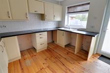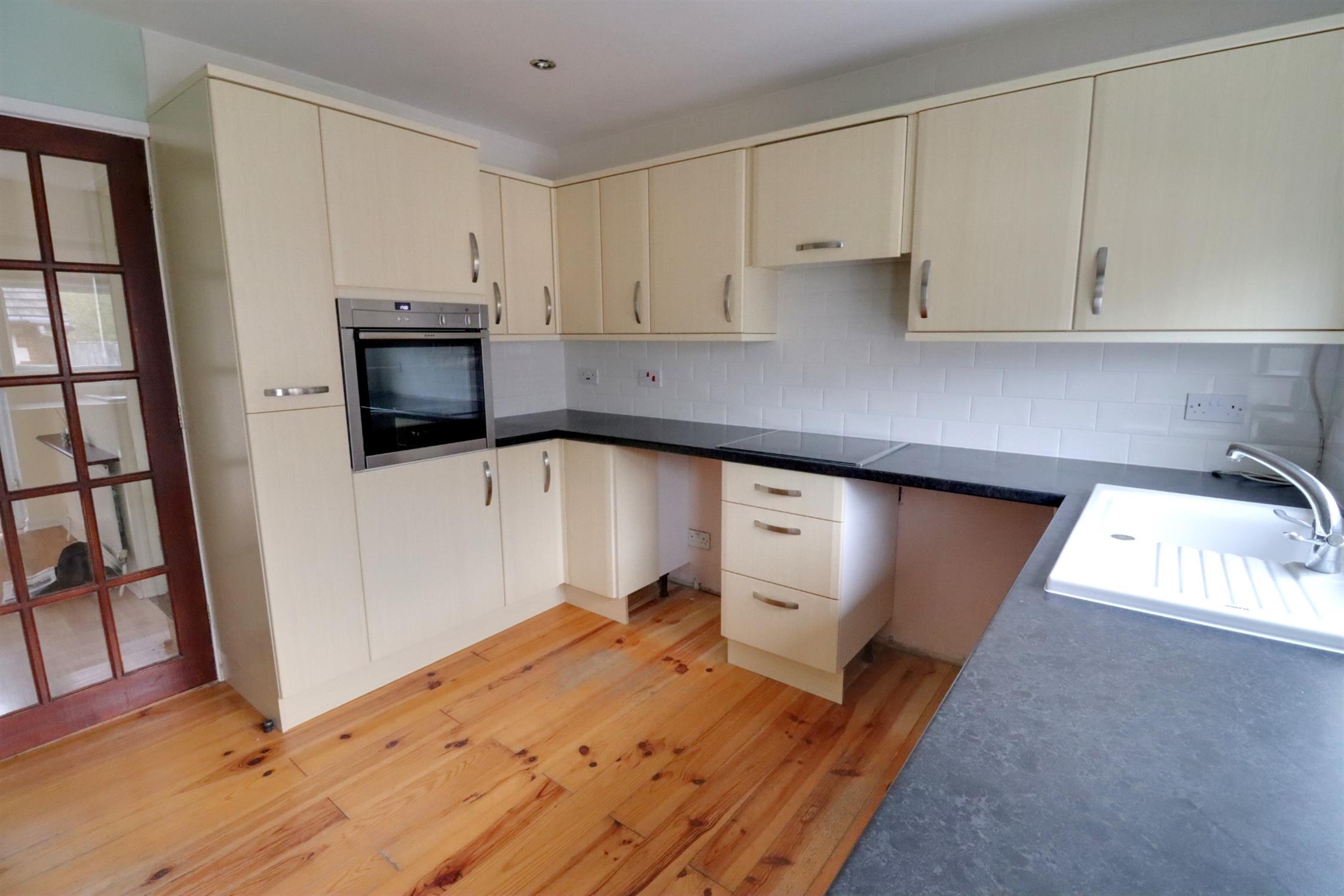 Double glazed window and door to side, matching range of wall and base units, roll top worksurfaces, inset enamel single bowl sink and drainer with mixer tap, tiled splashbacks, electric hob with overhead extractor, electric oven, plumbing and space for washing machine and slimline dishwasher, space for under counter fridge and freezer, radiator, shelved storage cupboard housing gas boiler.