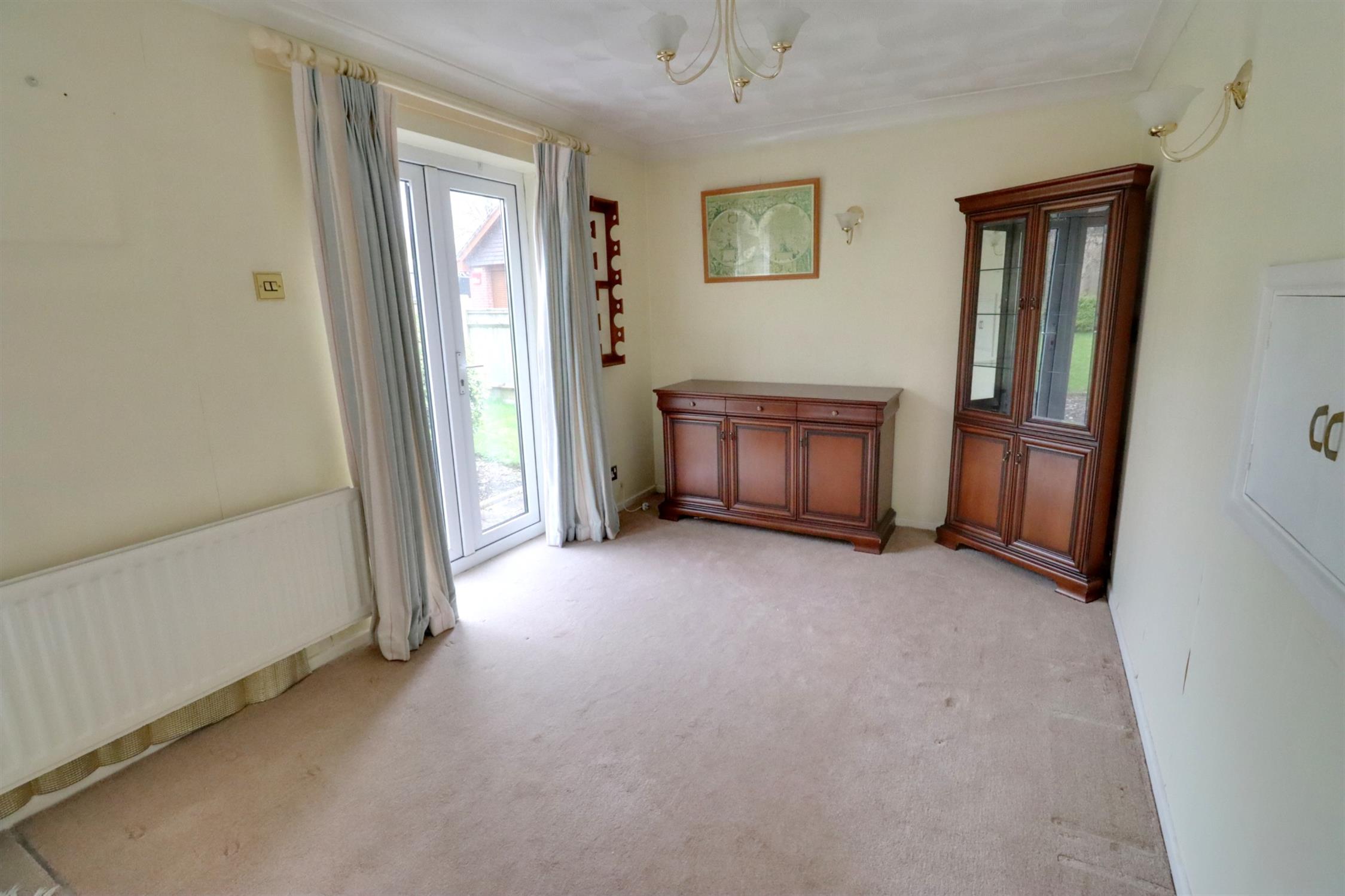 Two double glazed French doors to rear garden, feature fireplace with timber surround and stone hearth, electric fire, two radiators, serving hatch.