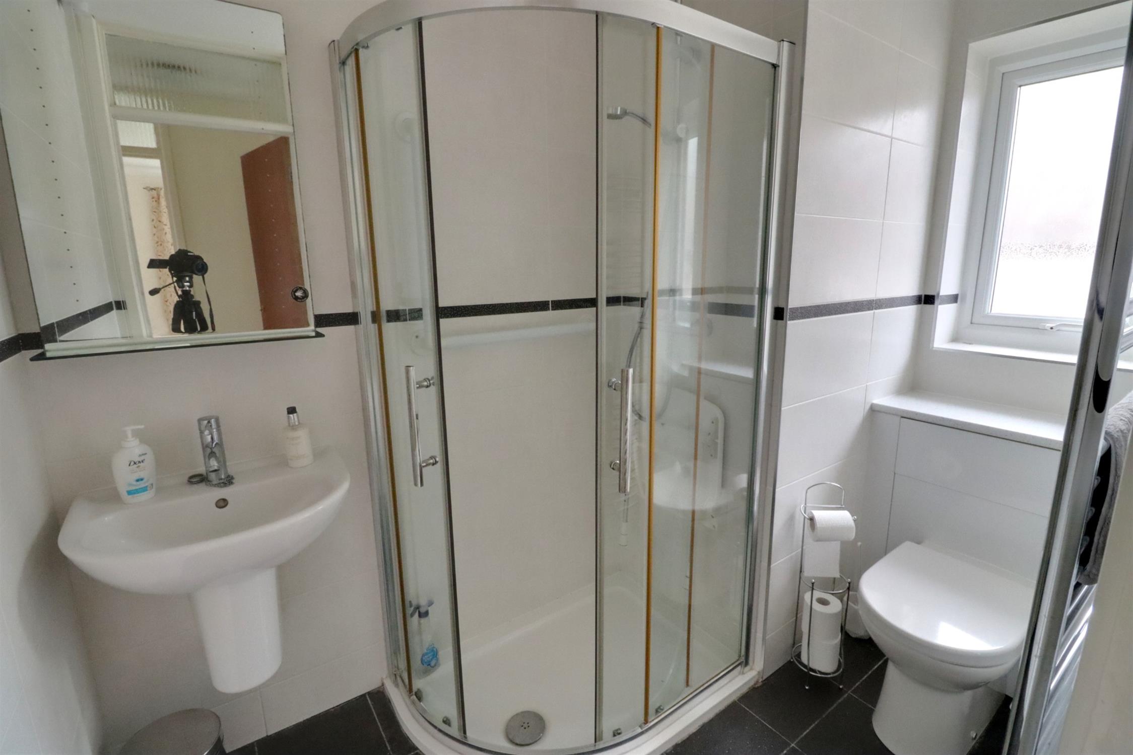 Opaque double glazed window to side, WC, wash hand basin with mixer tap, tiled corner shower cubicle, rainfall shower head with hand held attachment, ladder style towel radiator, tiled walls.