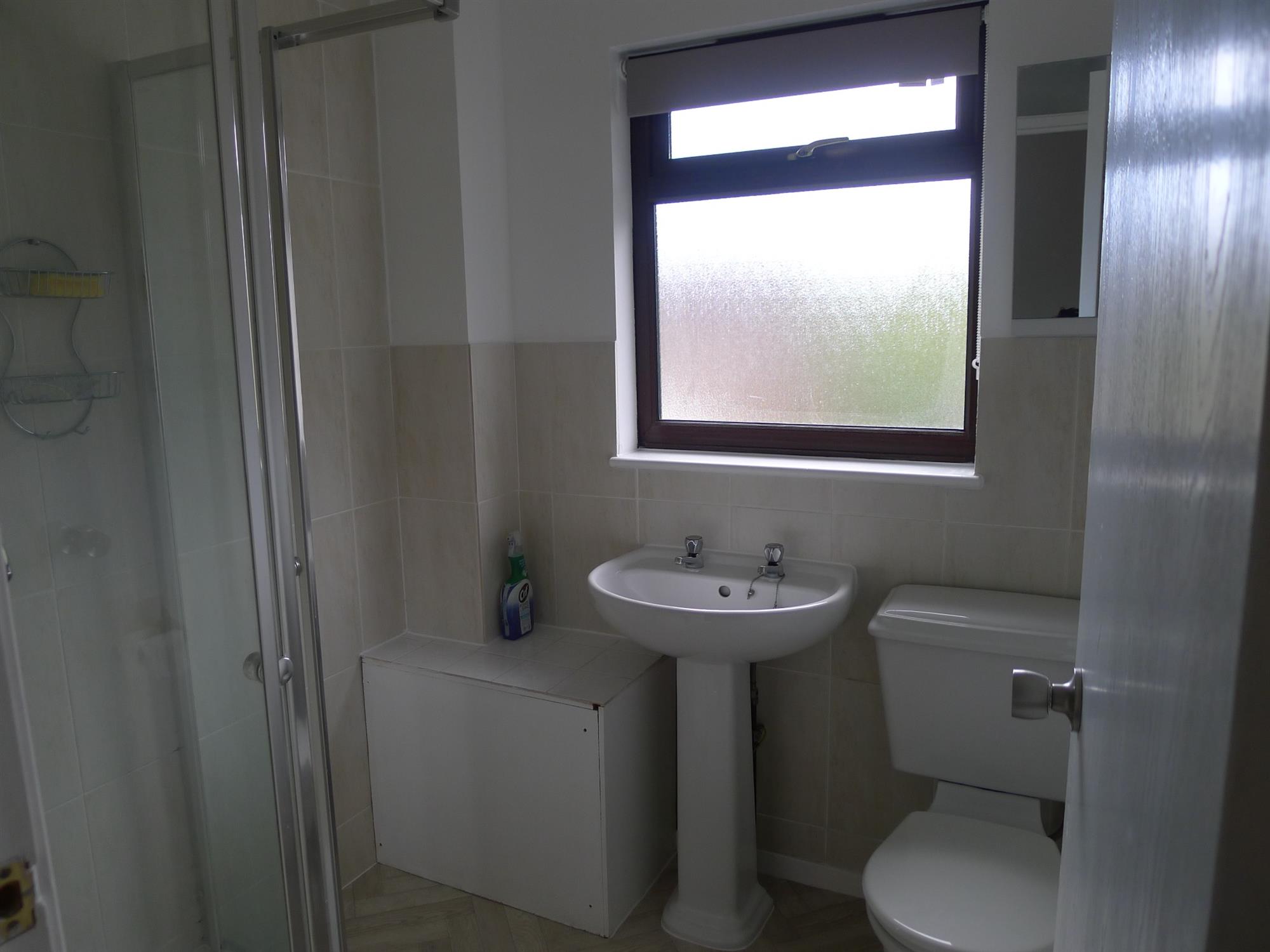 Three-piece suite comprising enclosed shower cubicle, low level WC and pedestal wash hand basin. Programmable heated towel rail. Part tiled walls. Vinyl flooring.