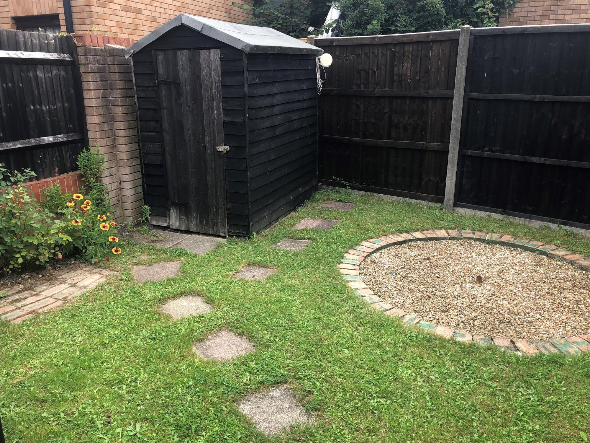 Enclosed by timber panel fencing. Laid to lawn. Shed. Shingled seating area.