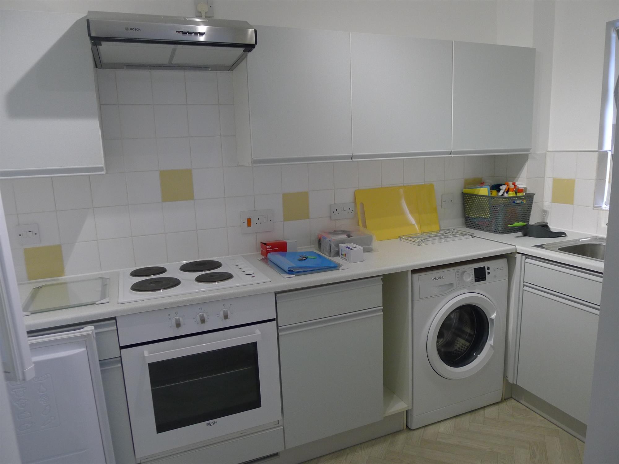 Double-glazed window to front aspect. Range of white base, wall and drawer units with roll edge work surfaces. Stainless steel single drainer sink unit. Tiling to splash backs. Fitted electric oven. Four ring electric hob with extractor hood over. Fridge freezer. Washing machine