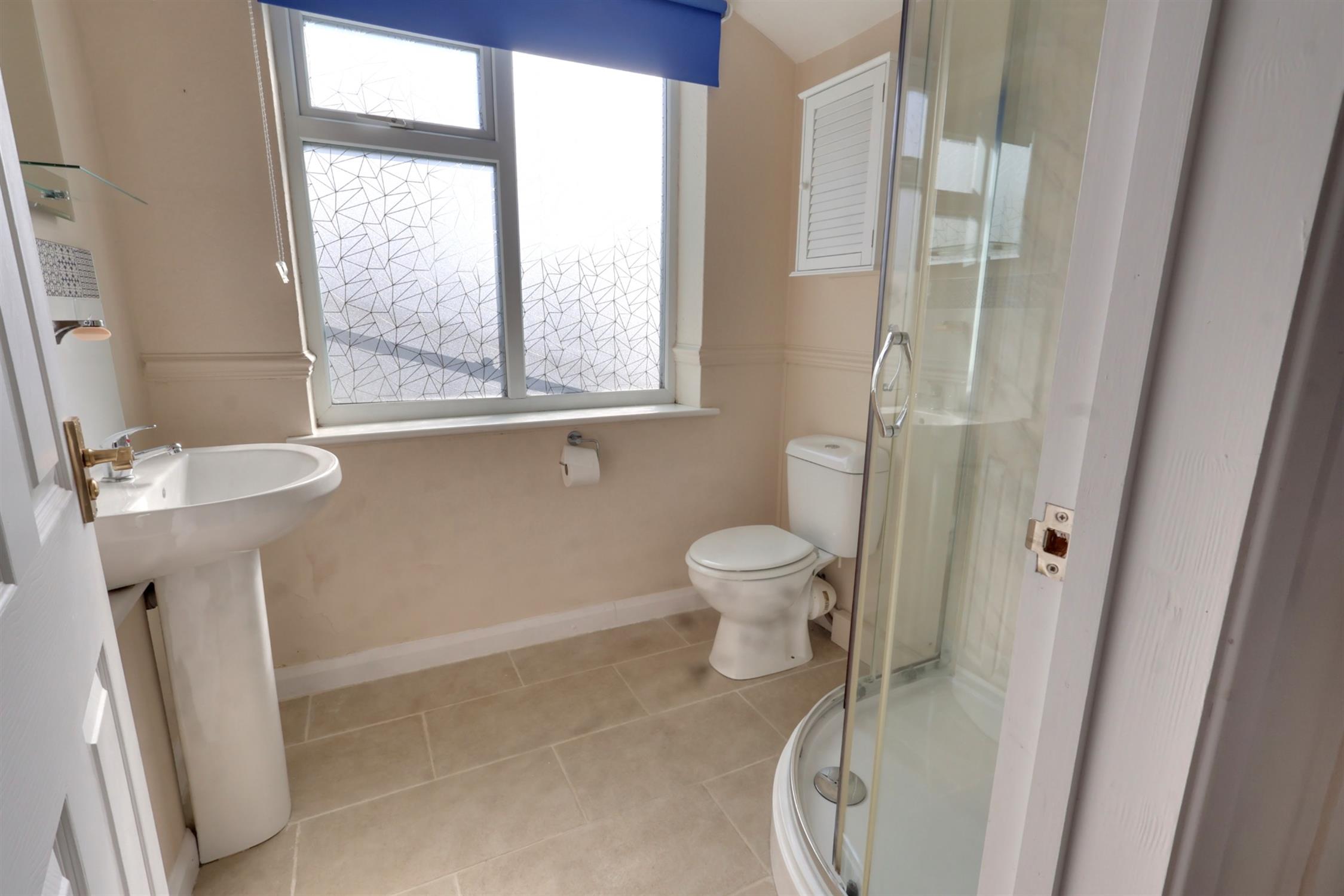 Step in corner shower. Low level WC. Pedestal wash basin. Ladder style radiator. Obscure double glazed window to rear.