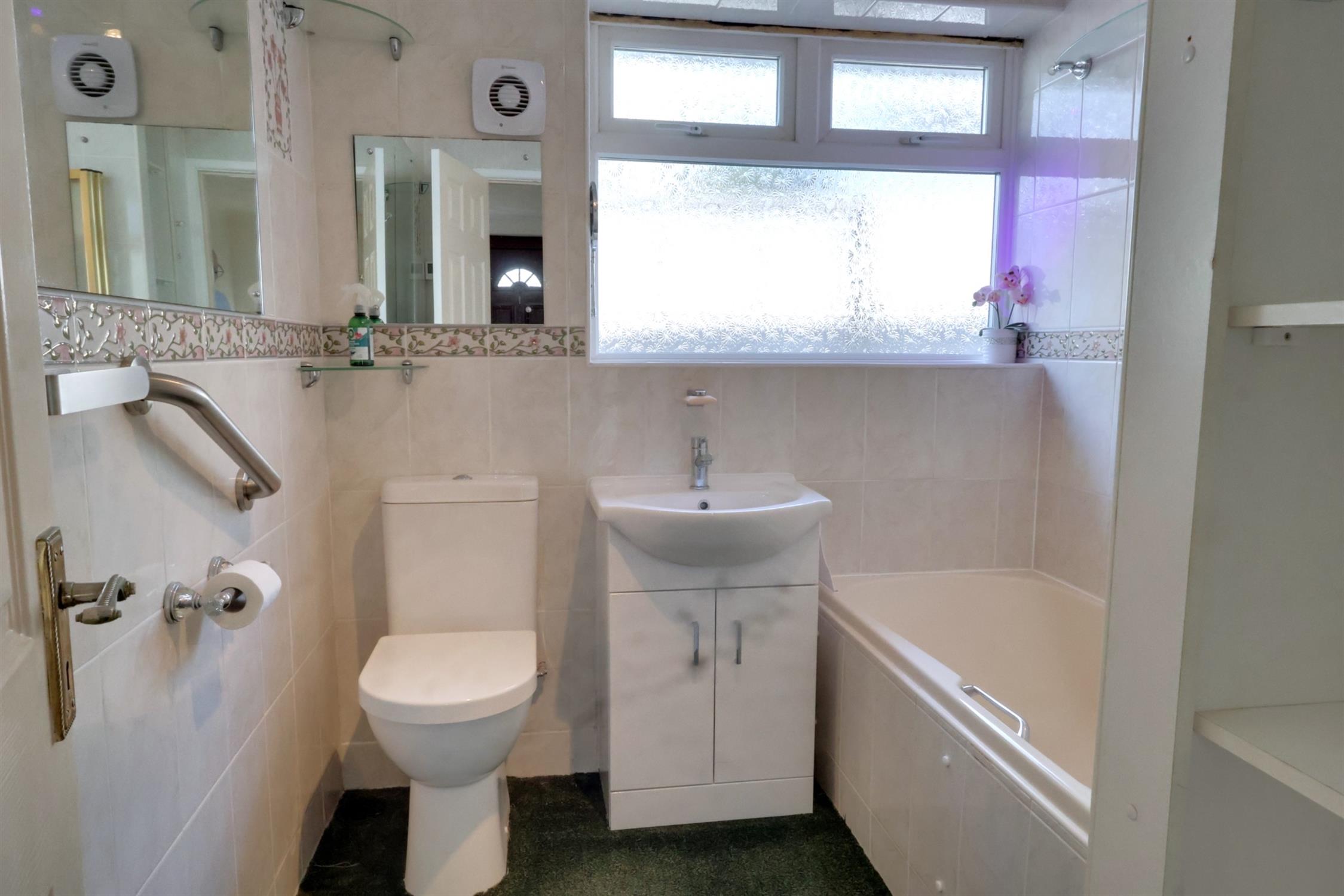 Fully tiled walls with vanity mirror.. Panel bath with independent shower over. Low level WC. Wash basin with cupboards below. Ladder style radiator. Obscure double glazed window.