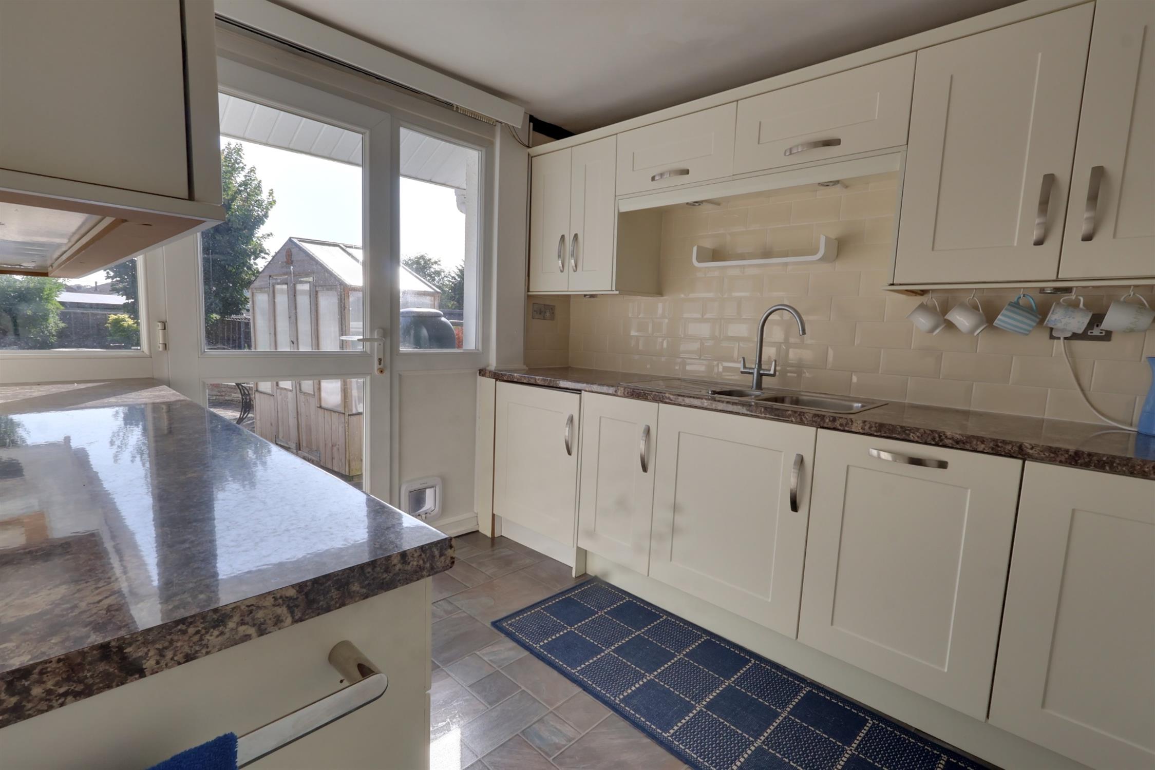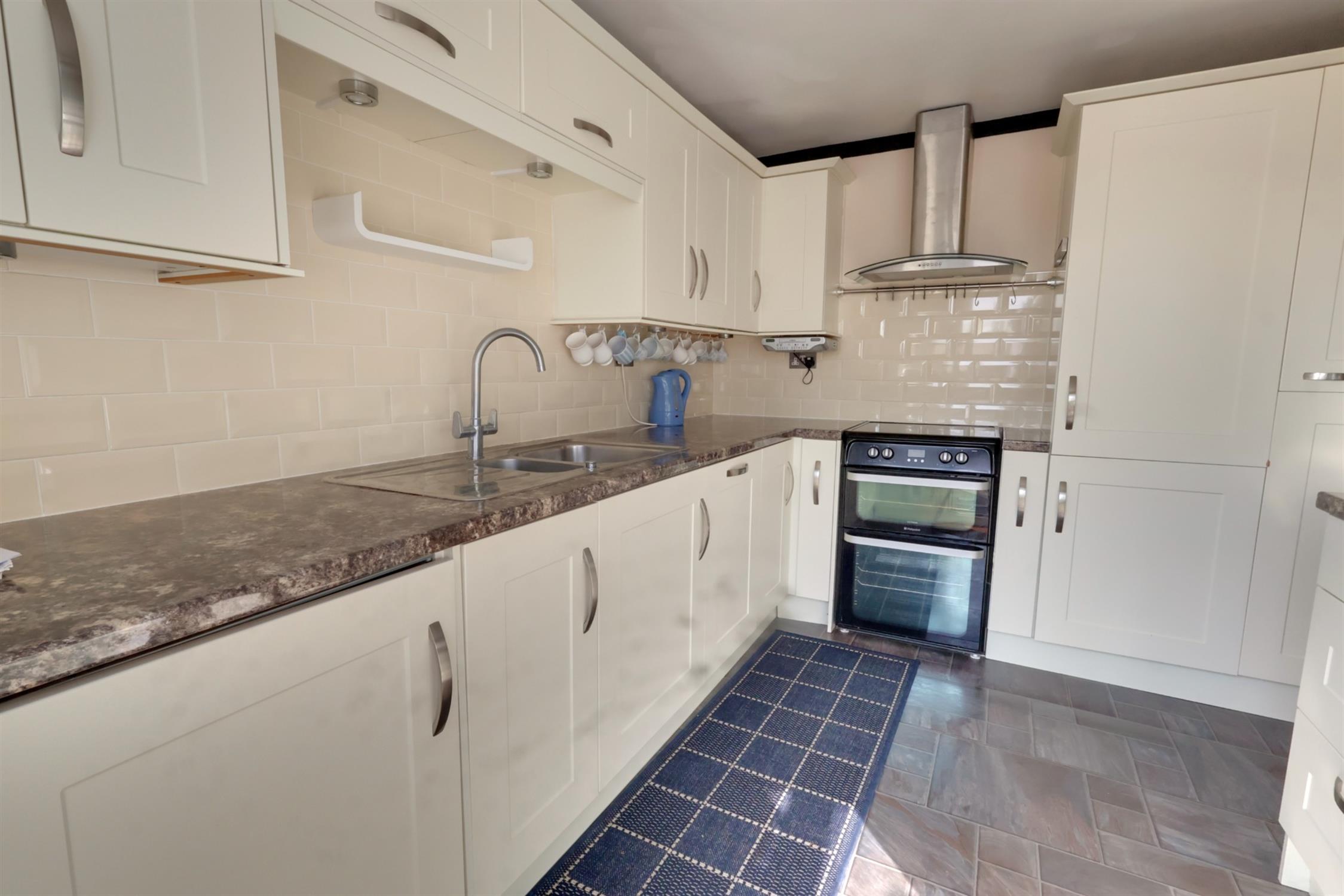 Range of fitted floor and wall units with contrasting work surfaces and complimentary tiling to walls. Inset one and half bowl sink unit. Integrated dishwasher. Fitted slot in electric hob and double oven with extractor hood over. Double glazed windows and door to rear garden.