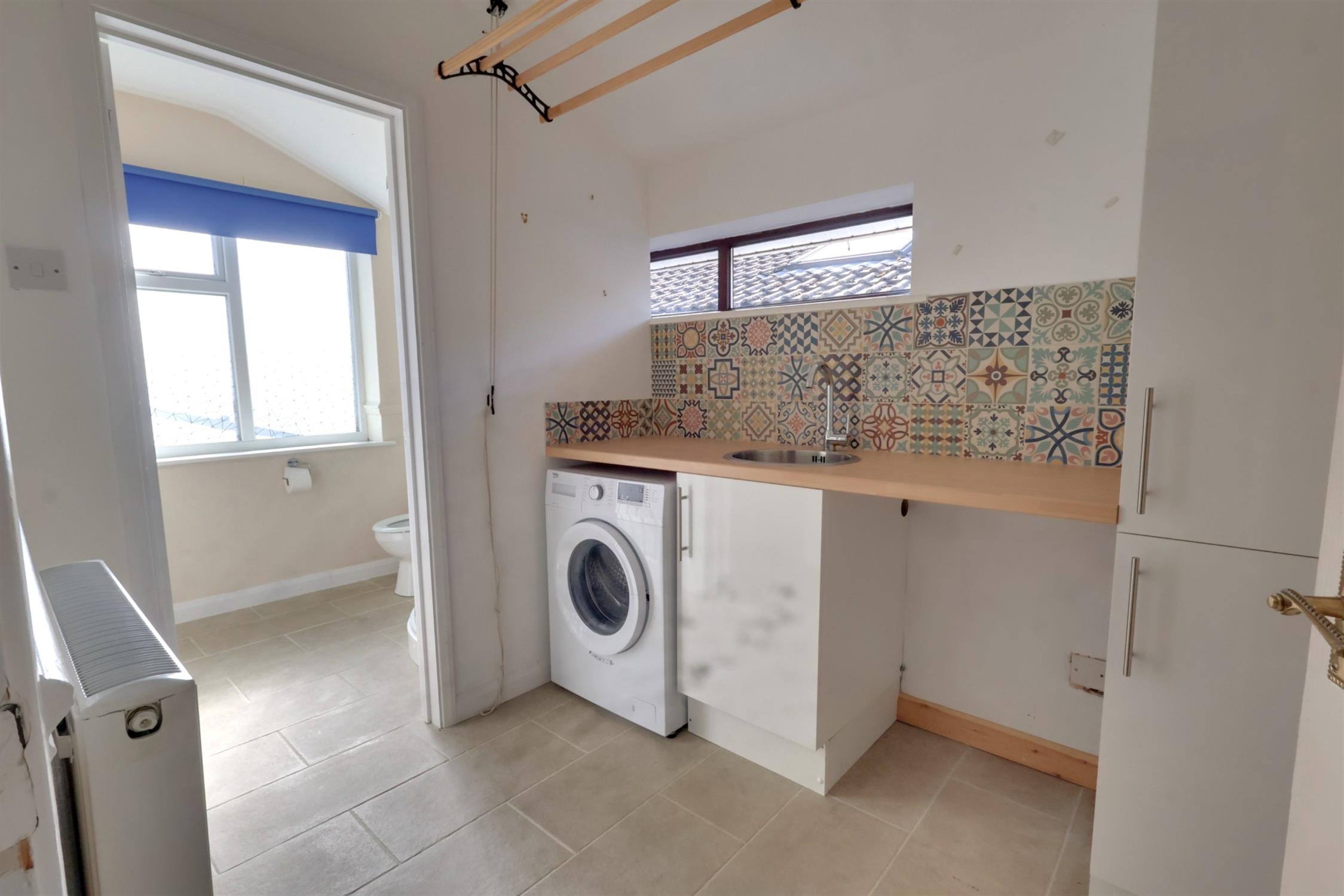 Work top with inset circular stainless steel sink. Plumbing and space for automatic washing machine and tumble dryer. Up right storage cupboard. Radiator. Tile floor. Double glazed window to side. Door to shower room.