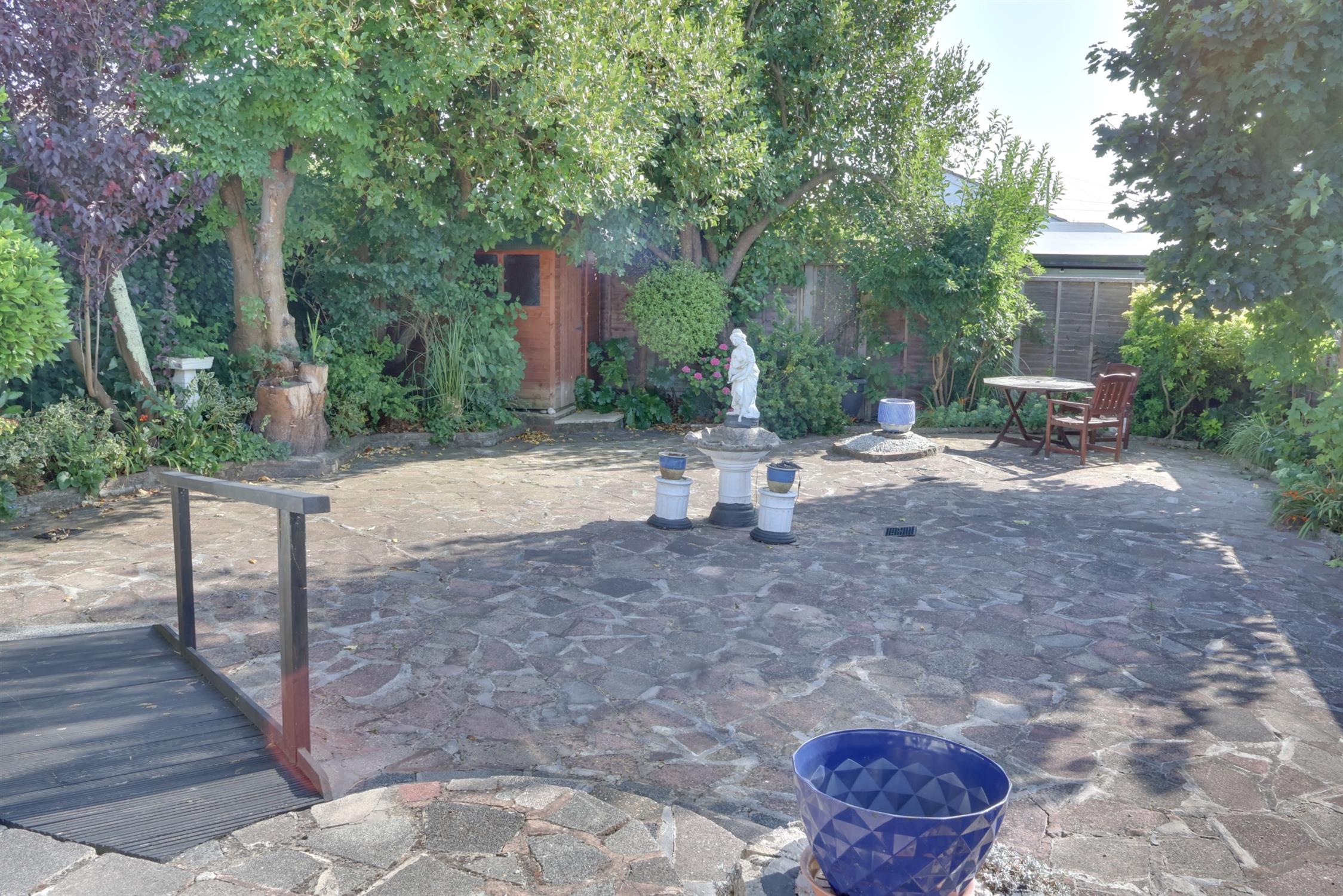 Attractive landscaped garden laid to an easy to maintain courtyard style with raised borders of mature flower and shrubs. Bar be que Summer house. Greenhouse. Outside tap and power points.