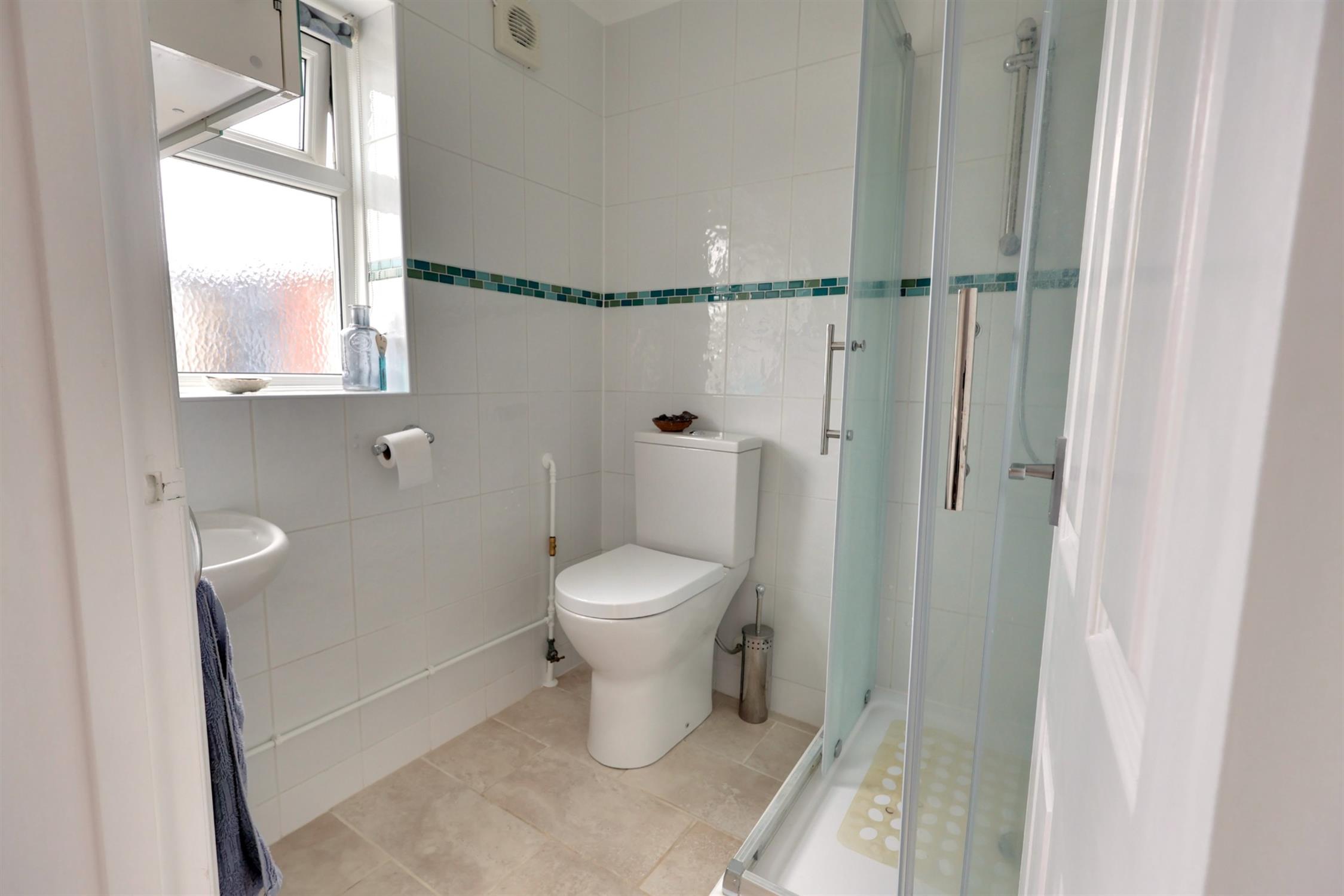 Fully tiled. Step in shower cubicle. Low level WC. Corner hand basin with mixer tap. Tile floor. Radiator. Wall mounted extractor fan. Obscure double glazed window to side aspect,