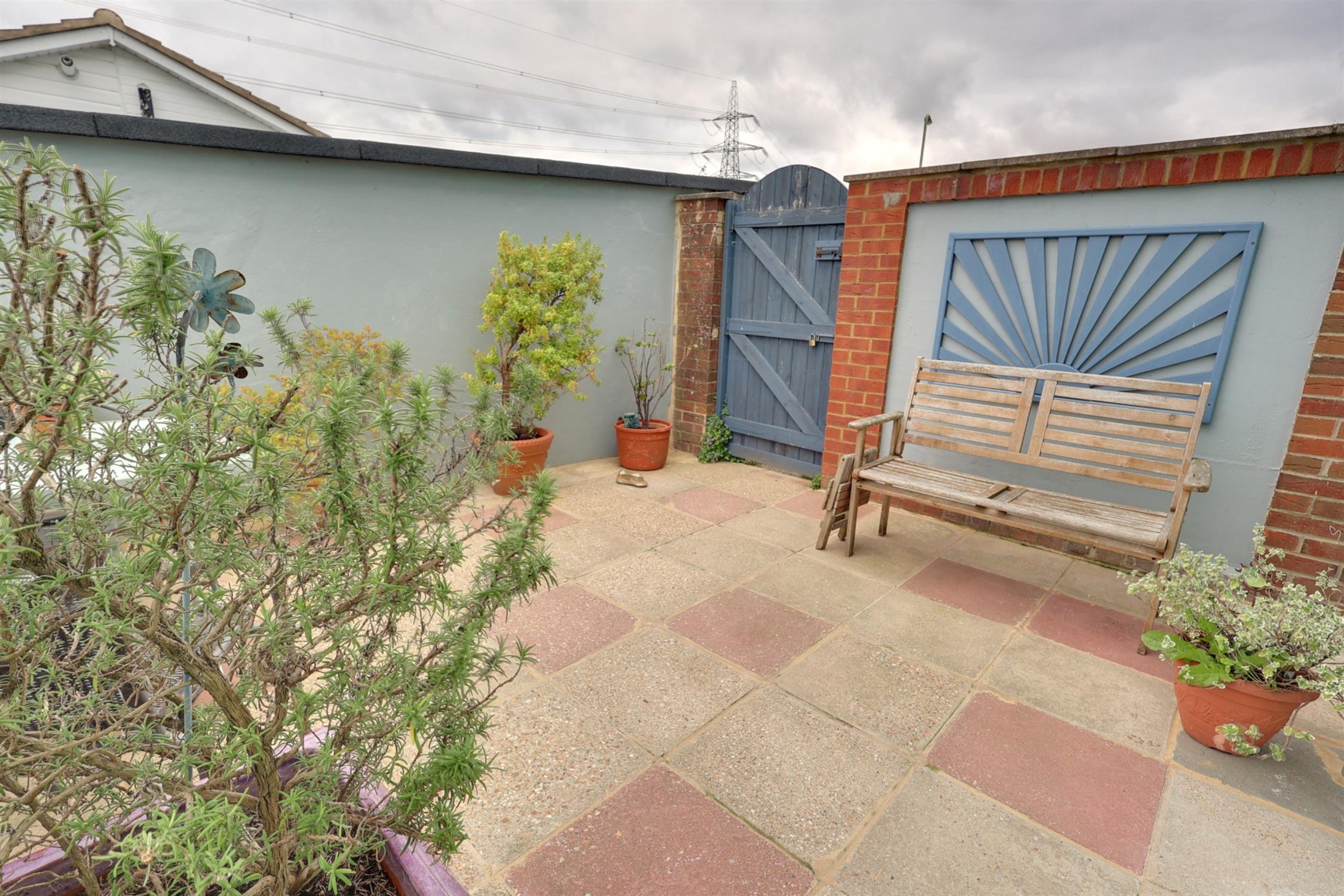 Courtyard style tiered garden with outstanding views of countryside from upper level. Steps and handrail lead down to lower paved patio with timber shed, outside courtesy light. Tap. There is a gated rear storage yard.