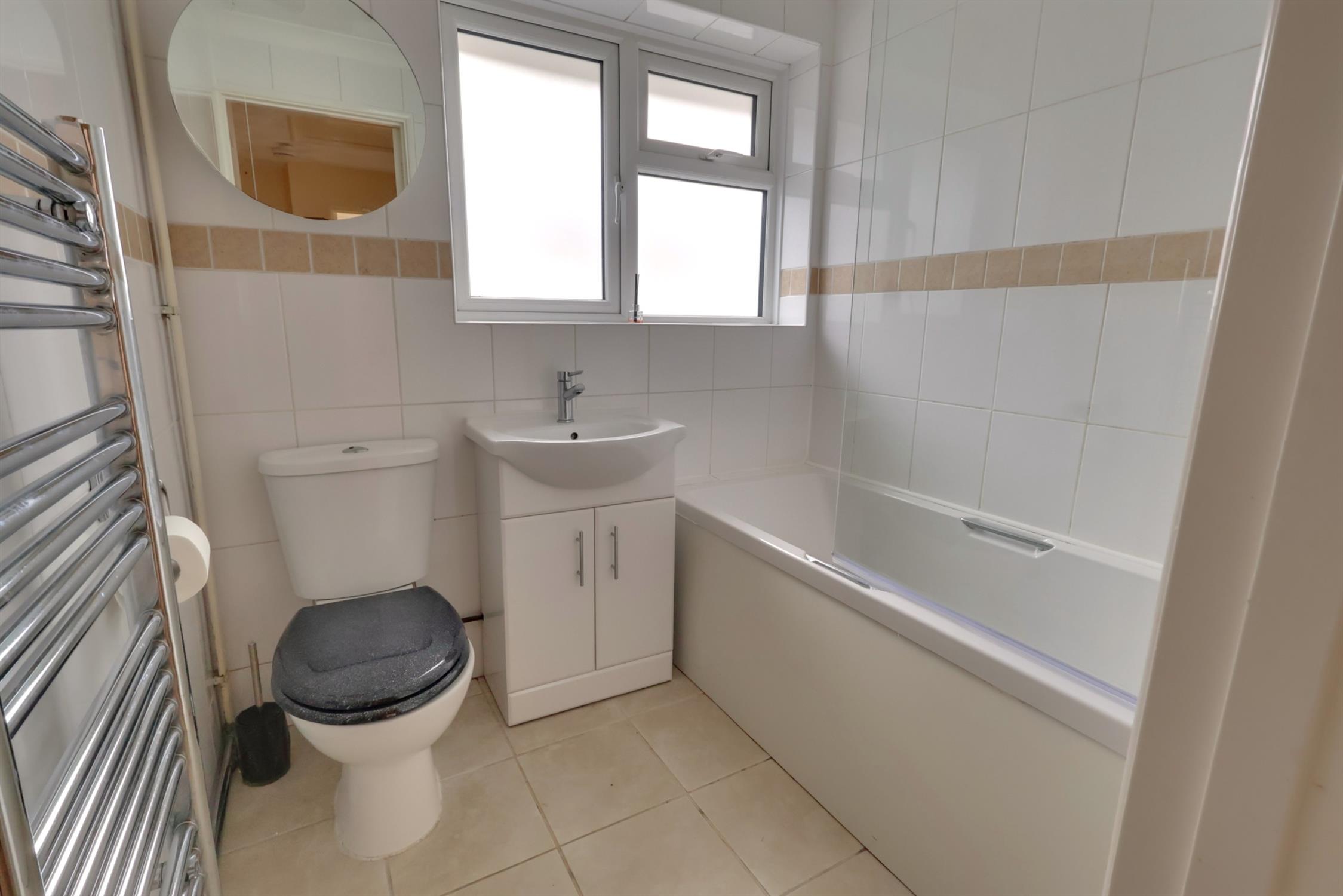 Opaque glazed window to side aspect. Panel enclosed bath with electric shower over. Pedestal wash hand basin. Low level WC. Tiled walls. Tiled floor. Ladder style towel radiator.