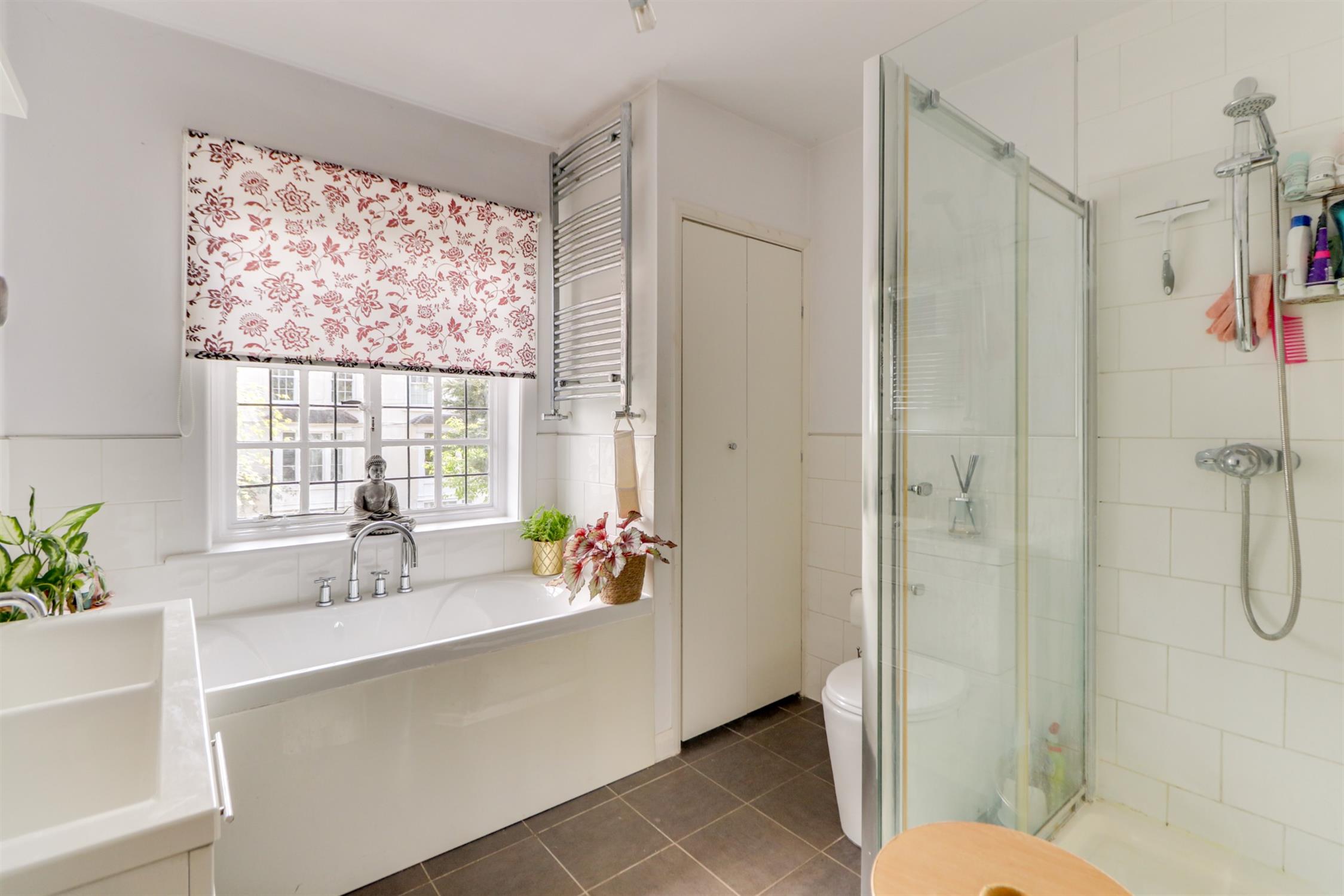 Smooth ceiling, window, ladder towel radiator, enclosed shower cubicle, bath with mixer tap over, tiled splashback, twin wash hand basins, low level W.C, cupboard housing space and plumbing for washing machine/dryer, tiled flooring.