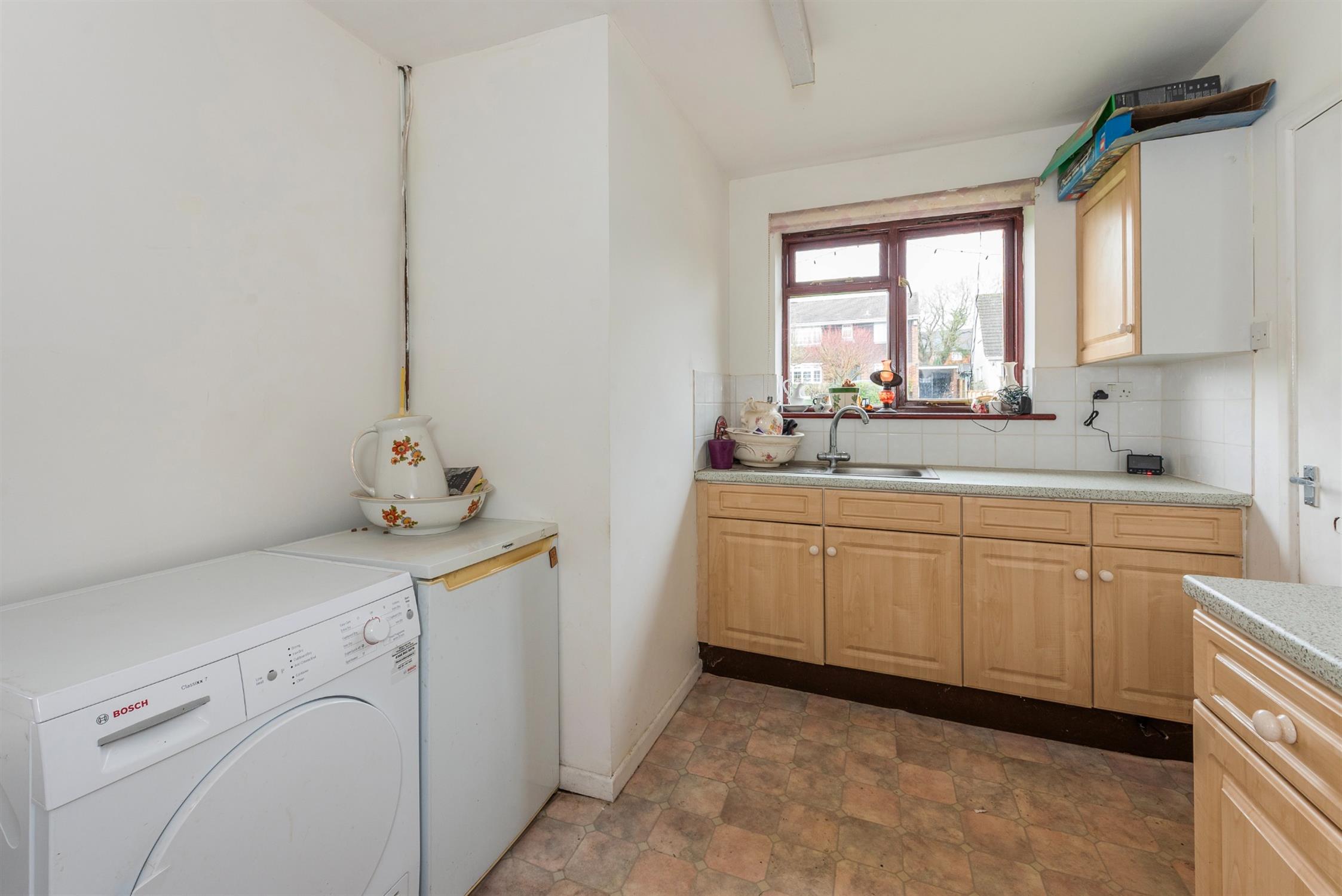 Fitted with base and wall units with tiled splashbacks, incorporating a stainless steel sink unit. Appliance spaces for fridge and tumble drier. Window to the front aspect.