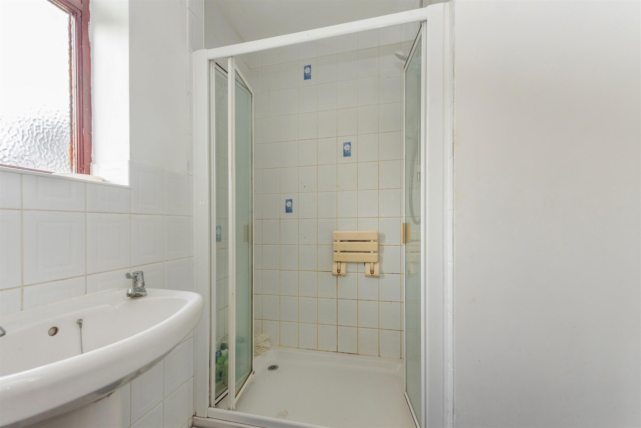 Fitted with a shower cubicle, pedestal wash hand basin and WC. Tiled floor. Window to the front aspect.
