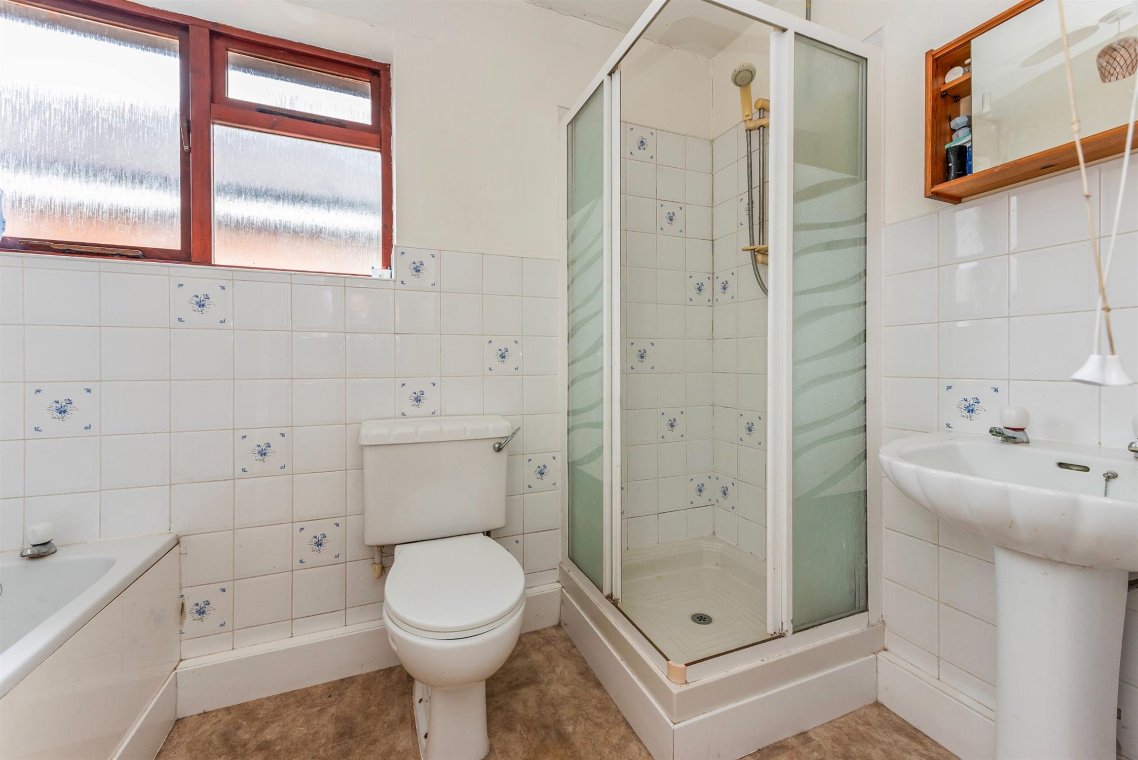 Fitted with a white suite, incoporating a panelled bath, WC, shower cubicle and wash hand basin. Window to the side aspect.