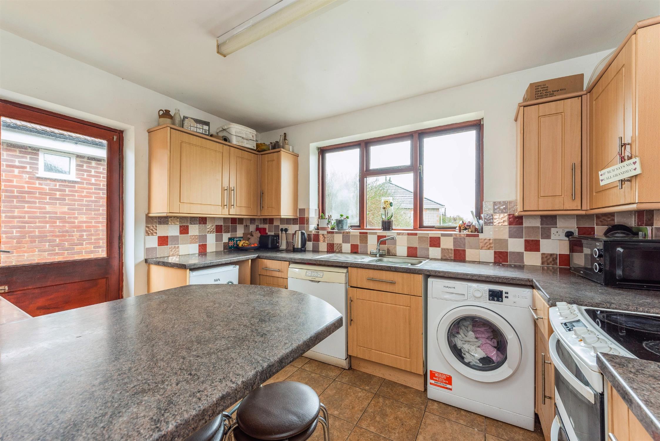 Fitted with a range of base, cupboard drawer and wall units incorporating stainless steel sink with mixer tap over. Breakfast bar. Tiled splashbacks. Appliance spaces for electric oven, washing machine, dishwasher and fridge. Tiled floor. Electric heater. Windows to the rear aspect and door to the side/driveway.
