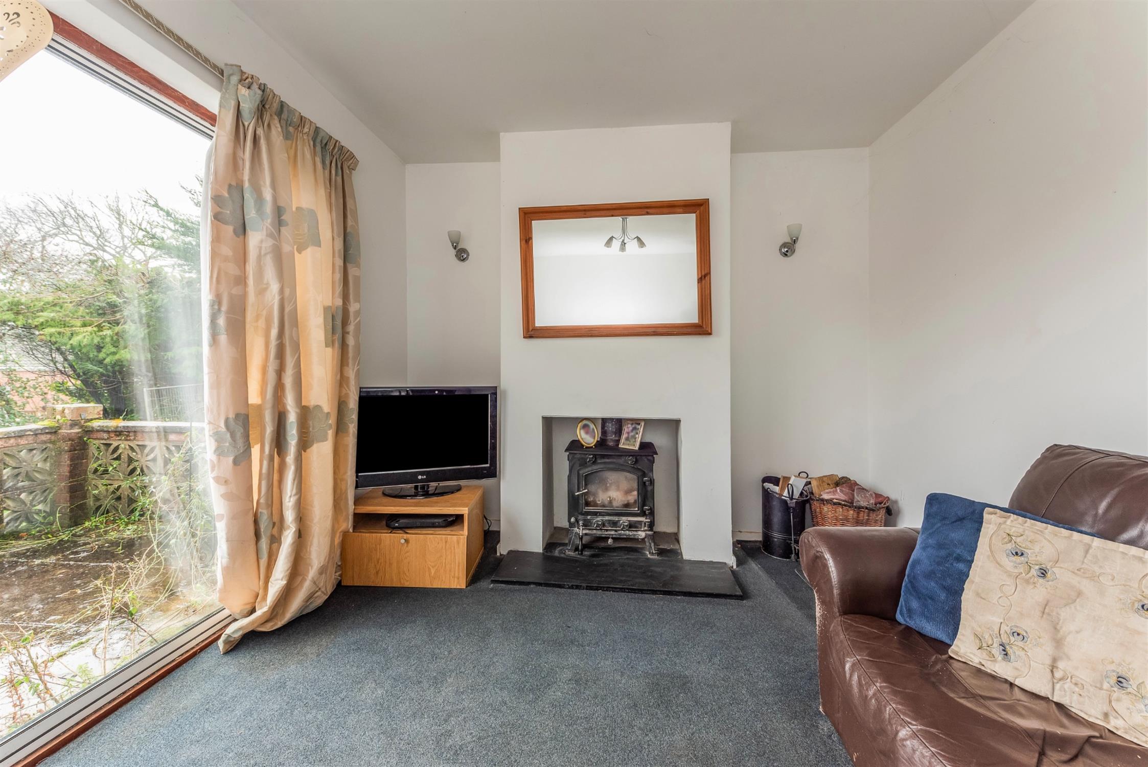 Fireplace with fitted wood burning stove. Sliding patio doors, overlooking and leading to the rear garden. Electric heater.
