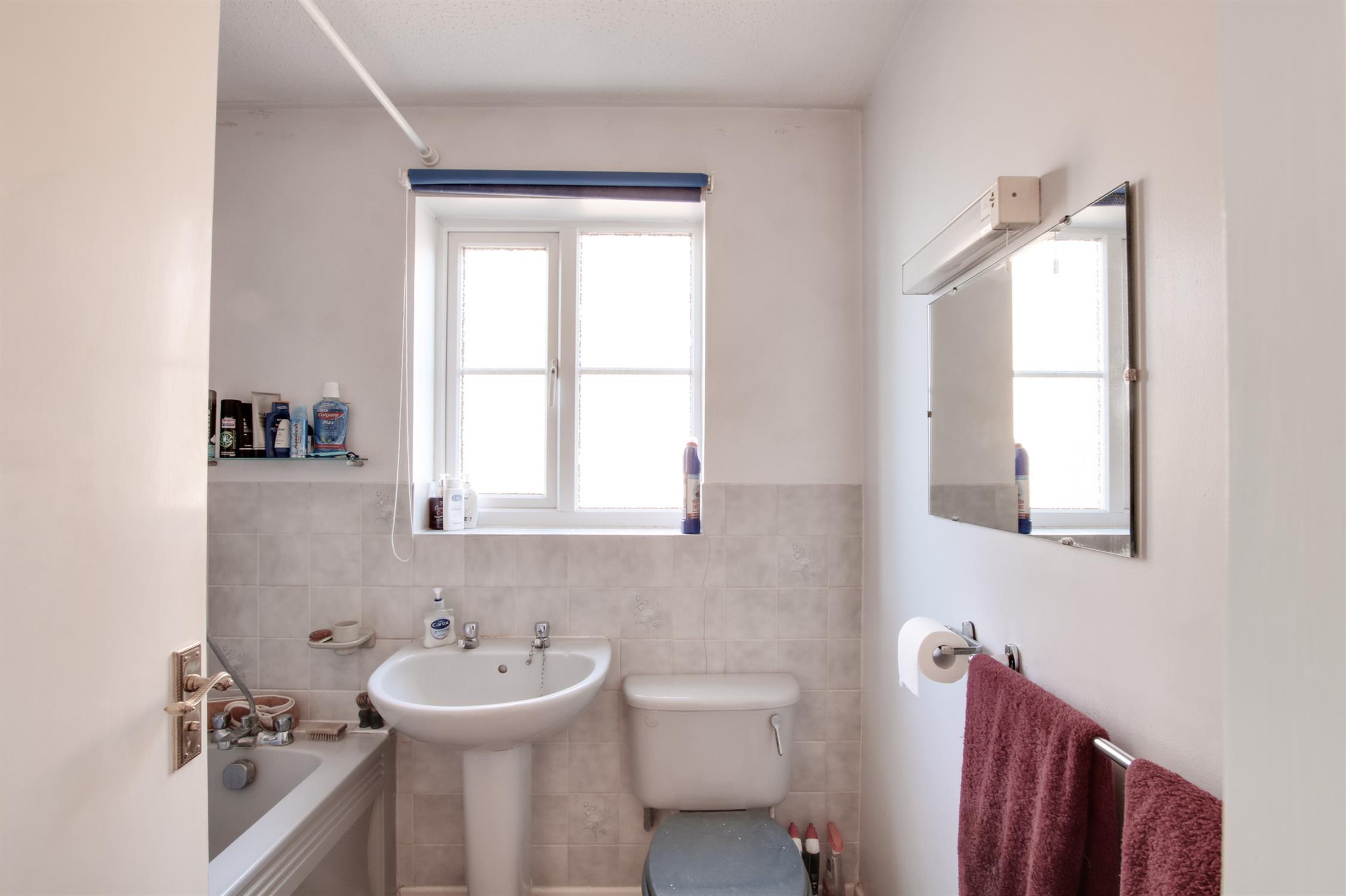 Bathroom suite comprising, panelled bath with shower over. Pedestal wash hand basin. WC. Tiled splashback. Part tiled. Radiator. Double glazed window to the side aspect.