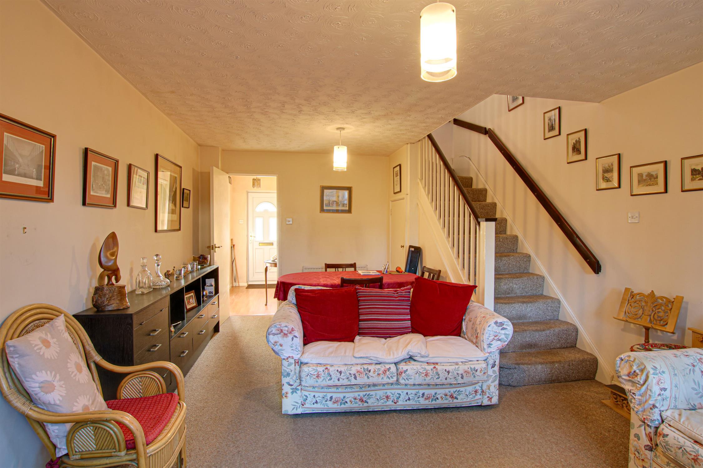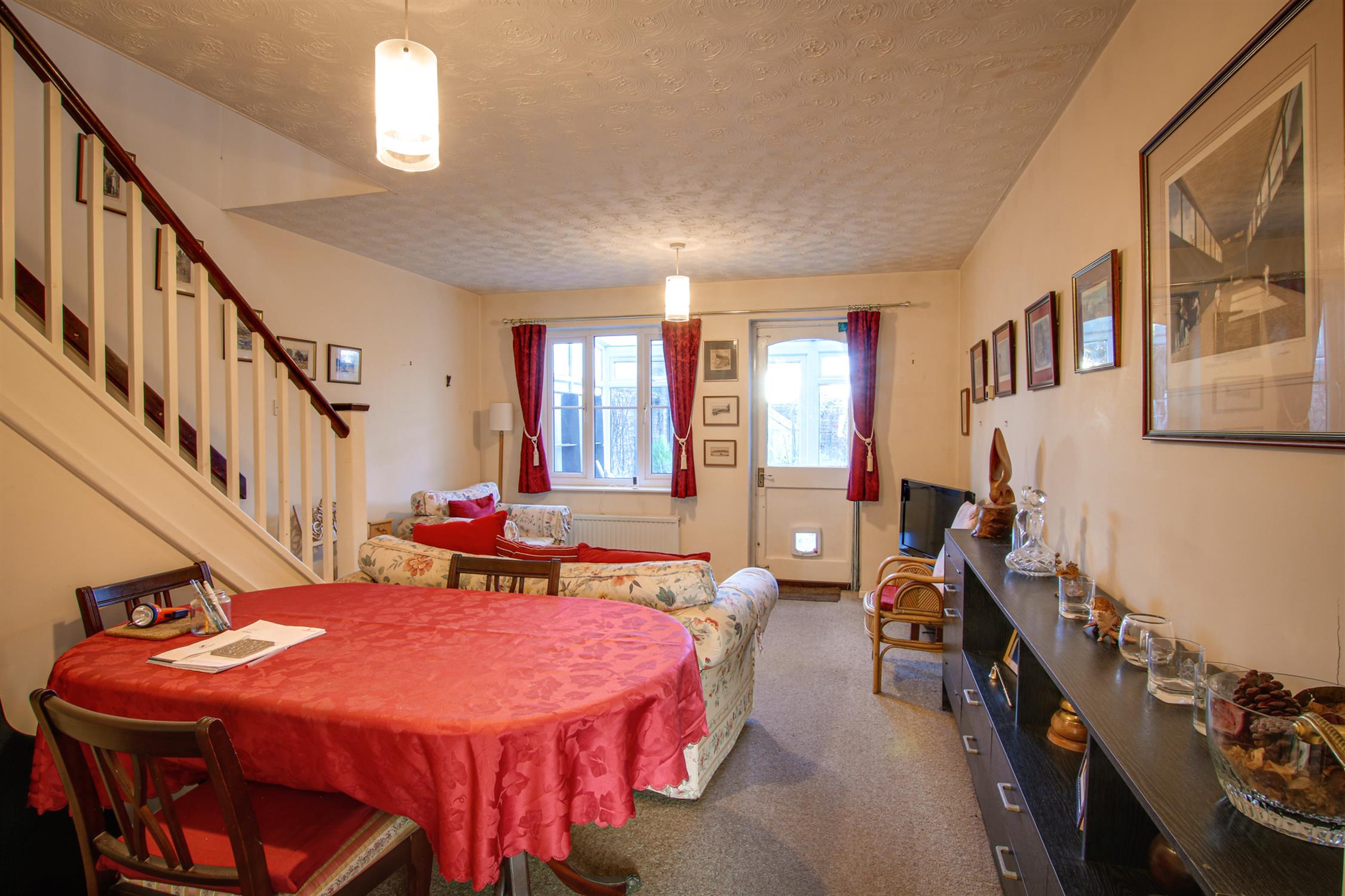 A comfortable open plan living/dining room with staircase leading to the first floor. Space for a dining table and chairs. Understairs storage cupboard. Two radiators. Double glazed window to the rear/conservatory aspect . Door leading to: