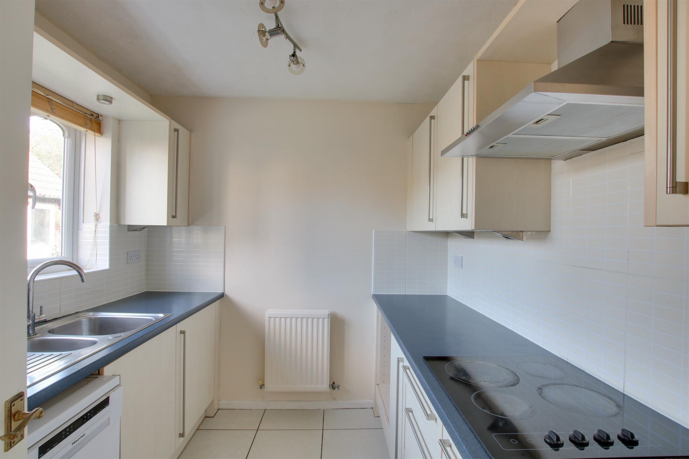 Fitted with base cupboards and wall units, incorporating a one and a half bowl sink unit with mixer tap over. Four-ring electric hob with extractor over. Spaces for appliances. Integrated fridge. Double glazed window to the front aspect. Tiled floor. Radiator. Cupboard containing glow-worm gas boiler.