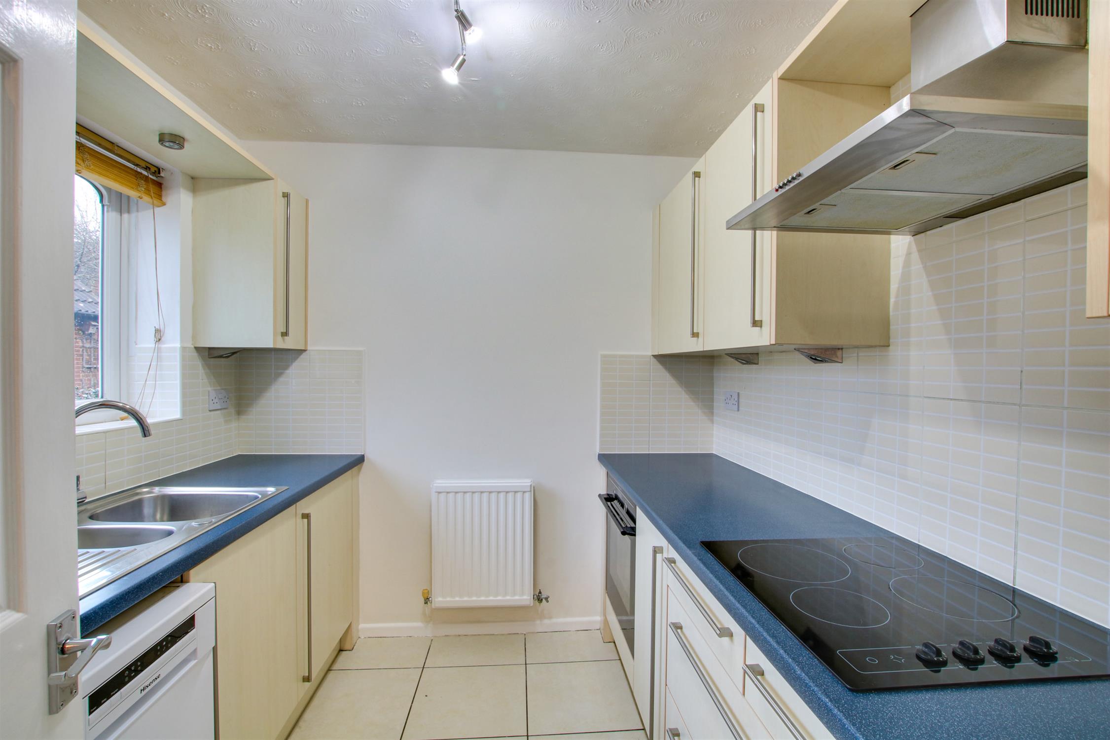 Fitted with base cupboards and wall units, incorporating a one and a half bowl sink unit with mixer tap over. Four-ring electric hob with extractor over. Buit under electric oven. Spaces for appliances. Integrated fridge. Double glazed window to the front aspect. Tiled floor. Radiator. Cupboard containing glow-worm gas boiler.