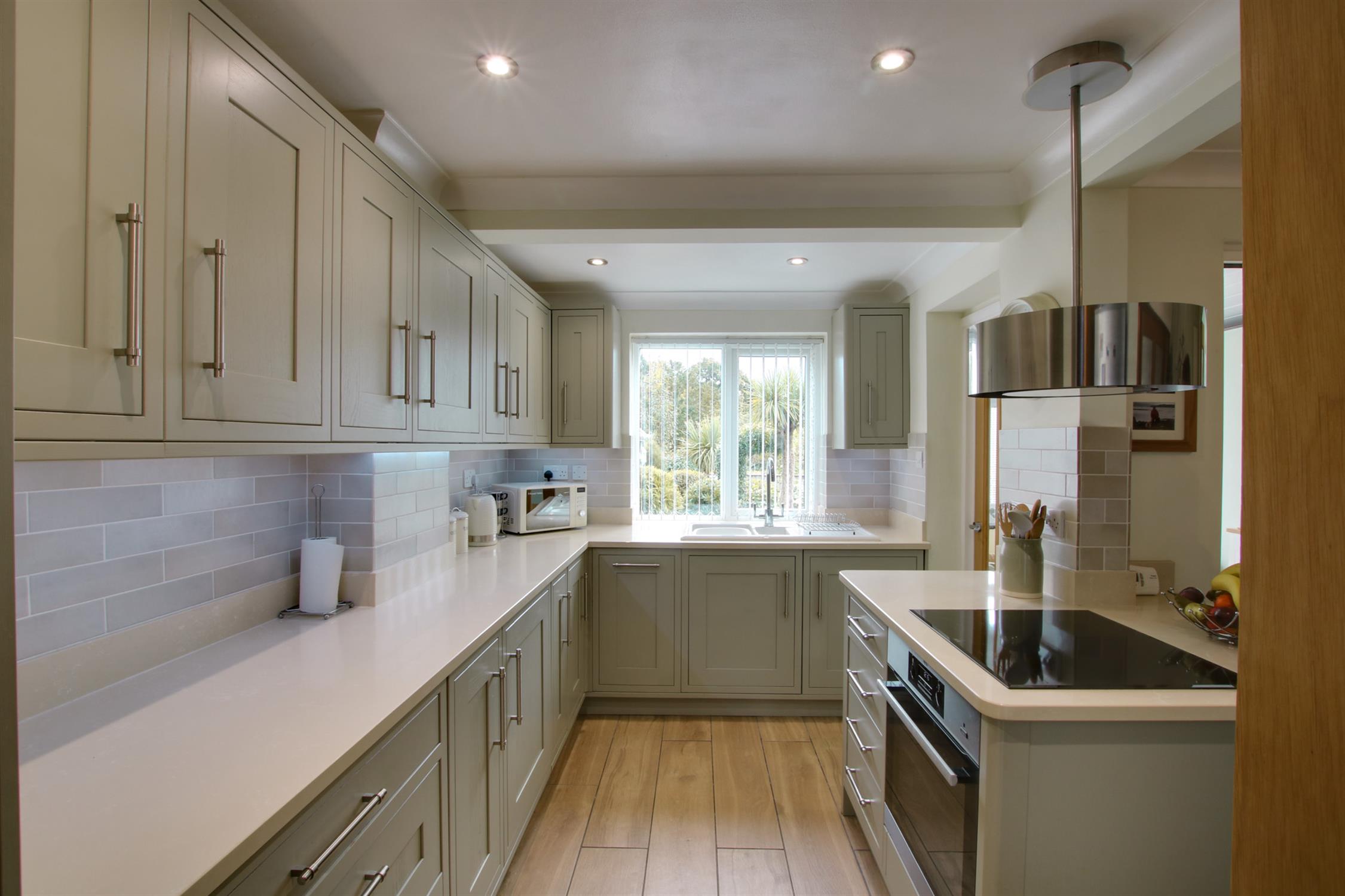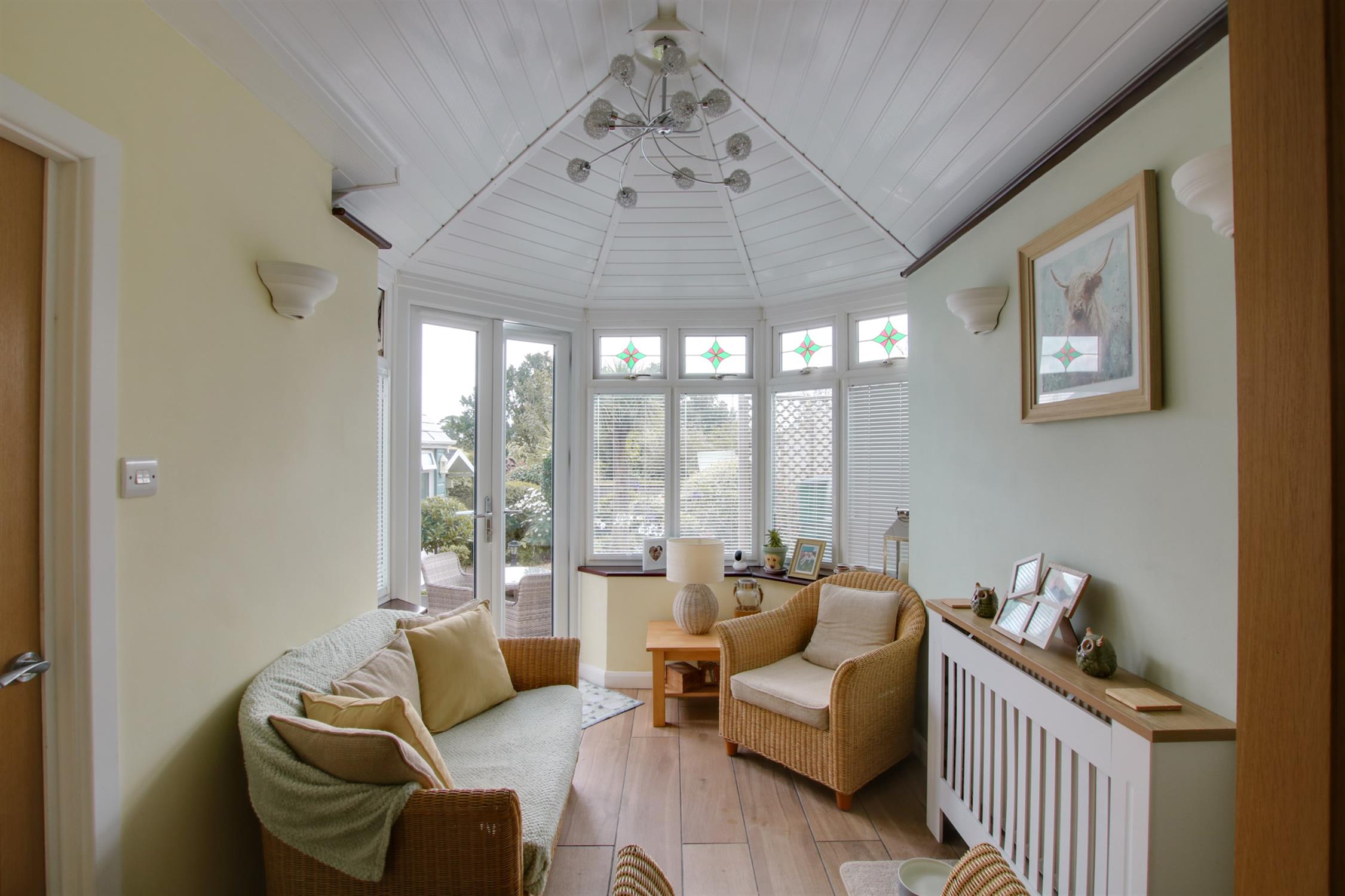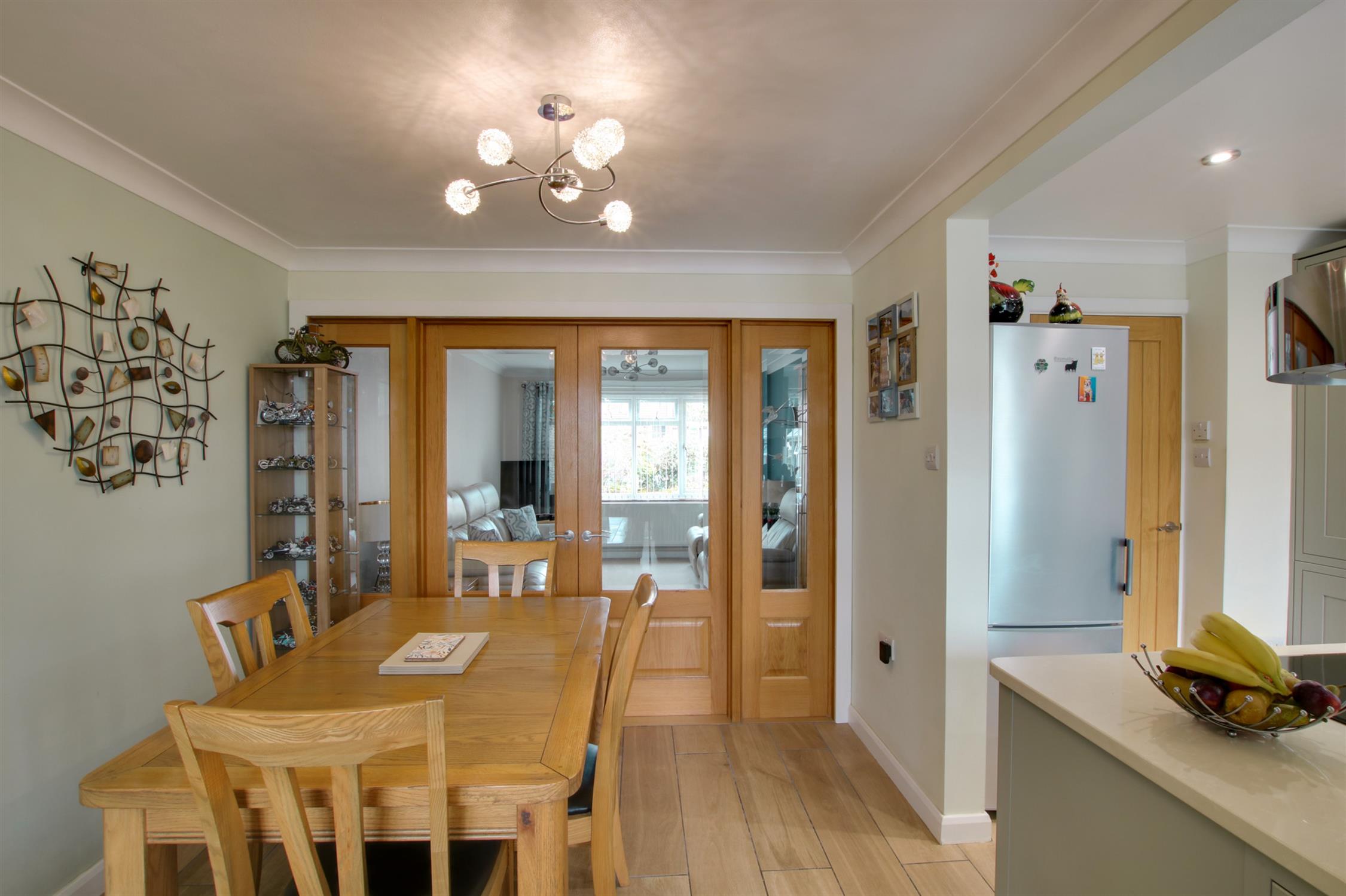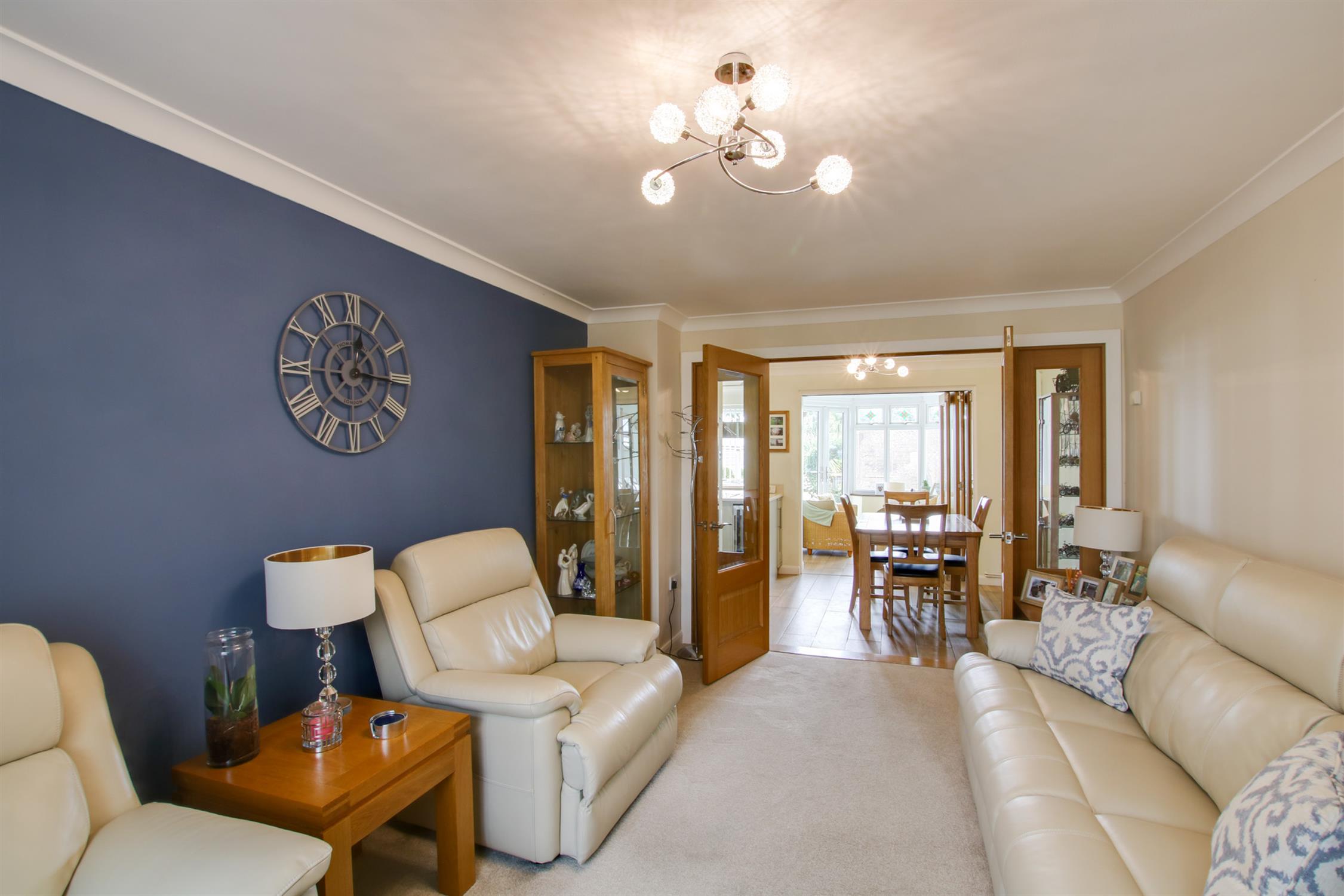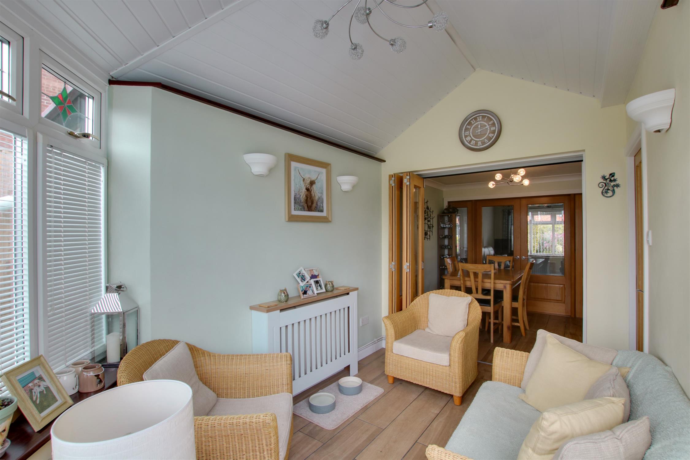 Superb spacious and light open plan kitchen, dining room and conservatory with double glazed bay window to the rear aspect. The stylish kitchen is fitted with a range of units, which incorporate wall, drawer and base units with complimentary worktops. Space for a fridge/freezer. Integrated dishwasher and washing machine. One and half bowl sink with mixer tap over. Island unit incorporating AEG electric oven and hob with extractor over. Integrated wine cooler. Cupboard housing 'Ideal' boiler. Tiled flooring. Two radiators. Inset lighting. Dining area with space for a dining table and chairs. Bi-fold doors opening into the conservatory. Double doors opening into the sitting room. Double glazed french doors opening out onto the rear garden from the conservatory.
