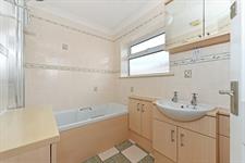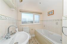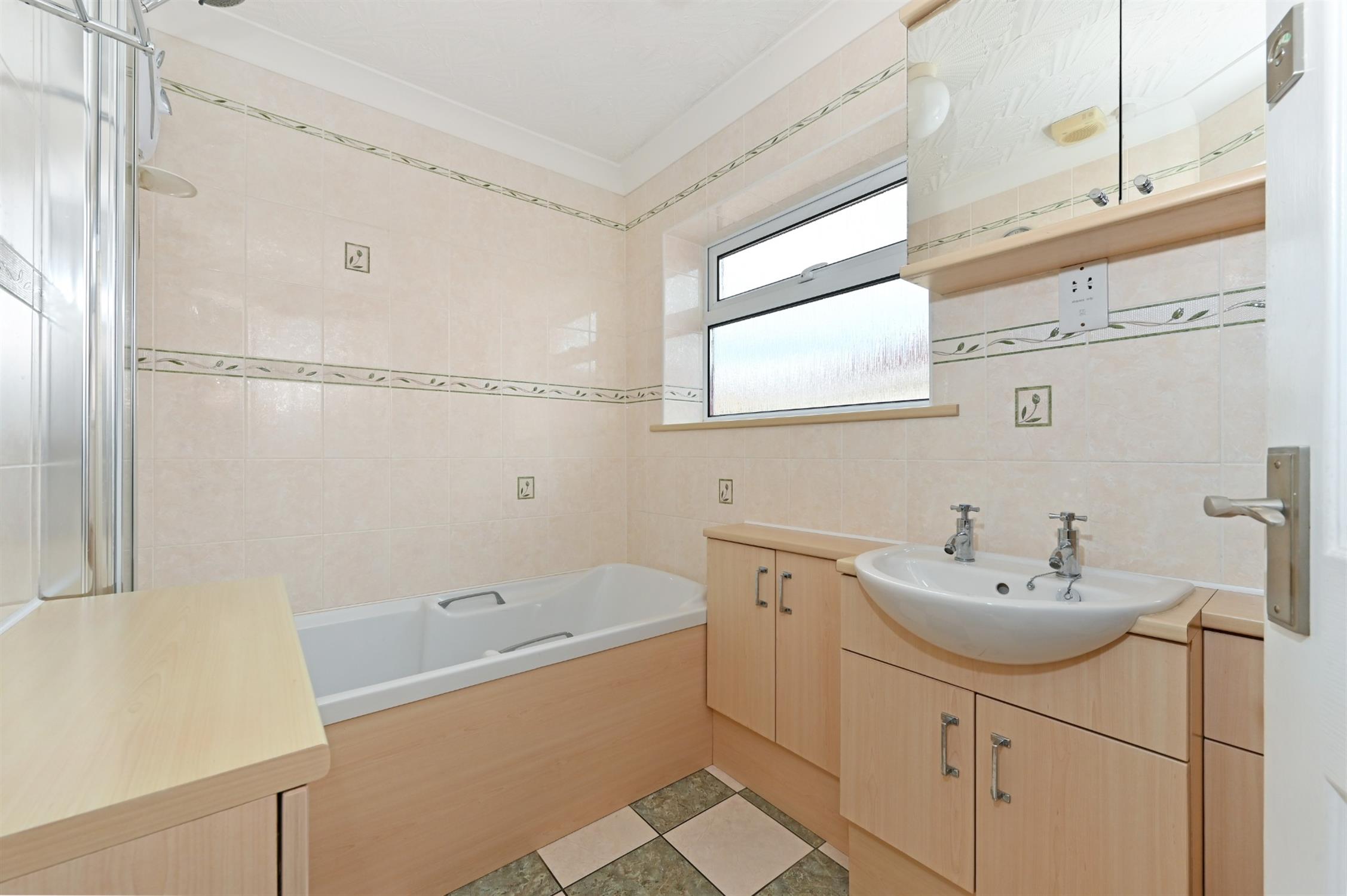 Comprising, panelled bath. WC. Vanity unit with wash hand basin and cupboard space below. Slimline wall mounted radiator and fan heater. Wall mounted storage cabinet. Extractor fan. Inset lighting. Part tiled. Vinyl flooring. Double glazed window to the side aspect.