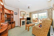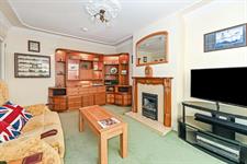 Fireplace surround with fitted gas fire. Radiator. Double glazed patio doors opening to: