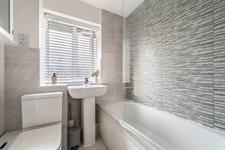 Fitted with a panelled bath with tiling, shower and shower screen. Pedestal basin and low level WC. Heated towel rail.