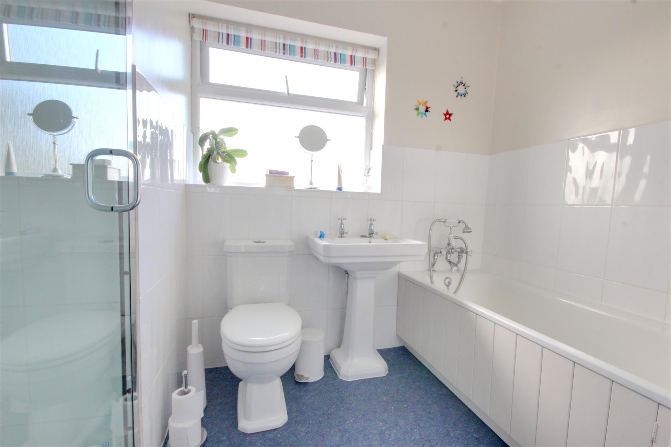 Panel enclosed bath, separate walk in shower enclosure, low level WC, wash basin in pedestal, heated towel rail, sunken spotlights, rear aspect double glazed obscured window.