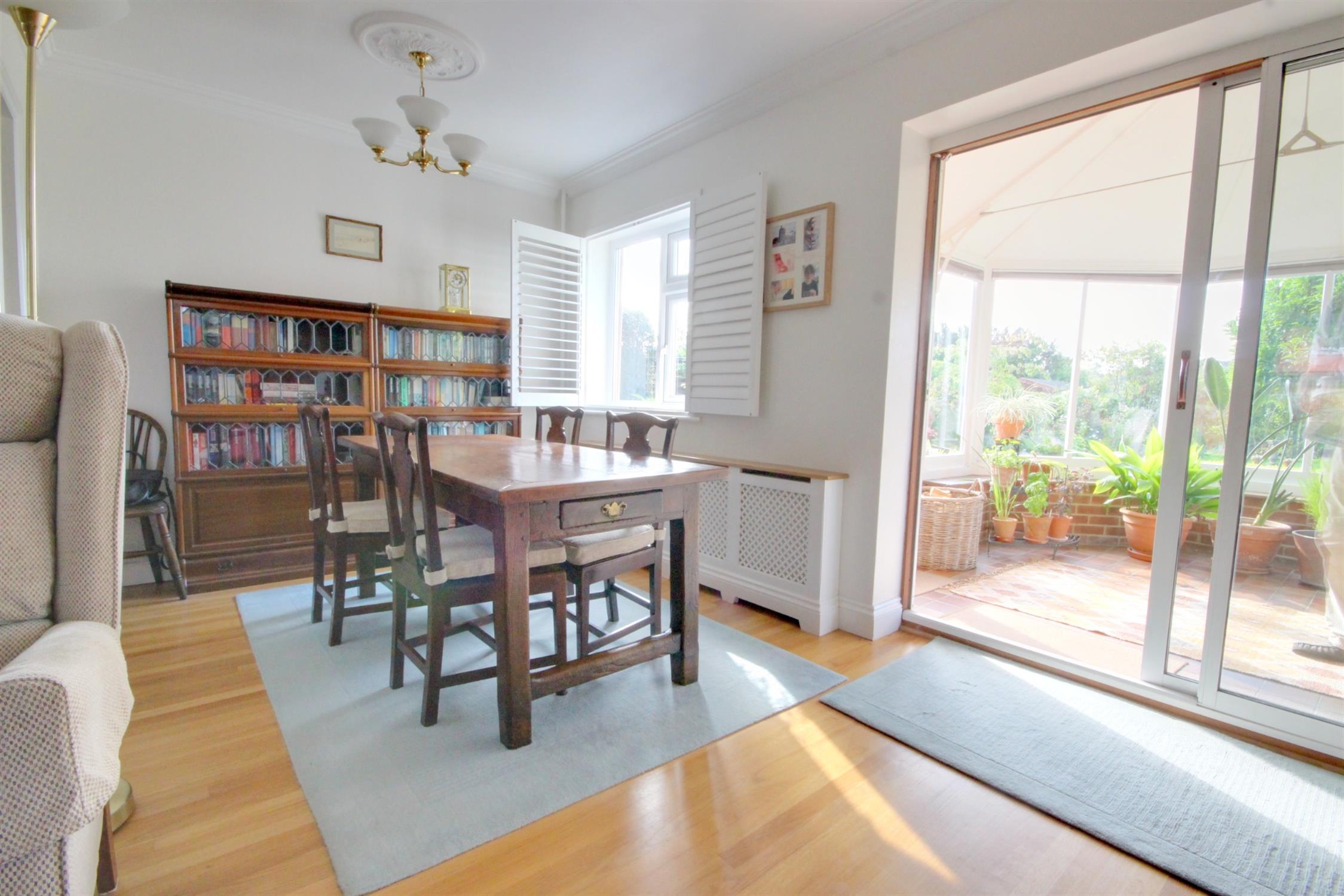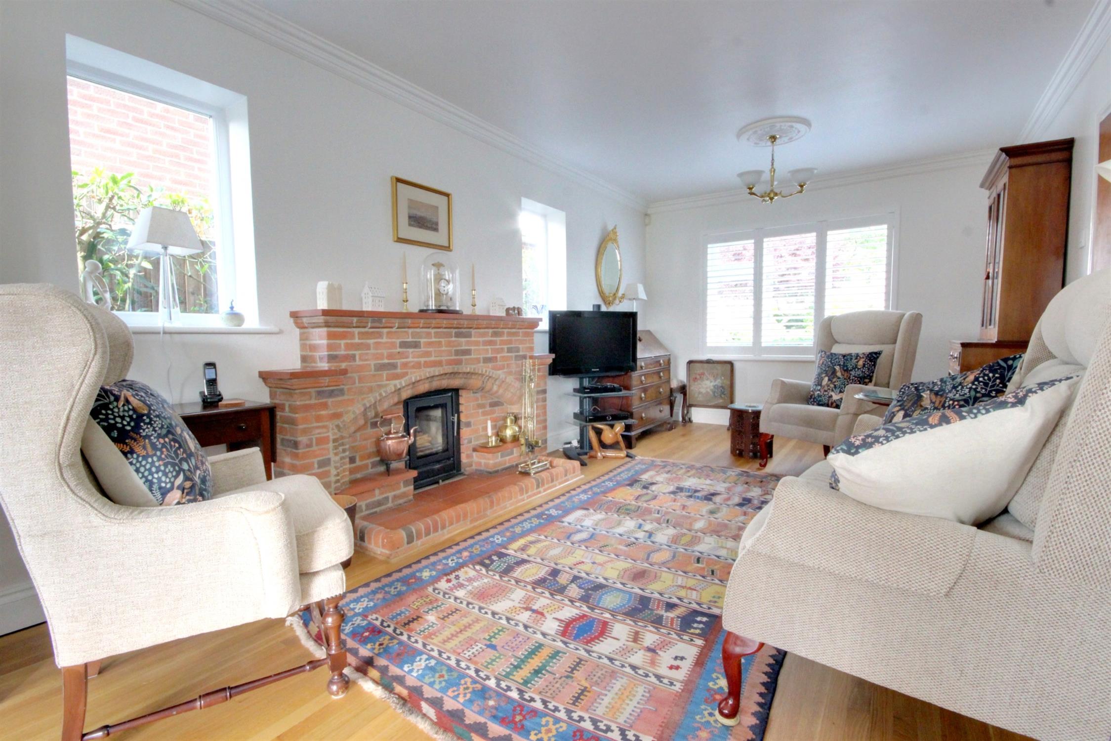 A triple aspect room with front, rear and side aspect double glazed windows with fitted shutters, cassette wood burner set in a brick fireplace, American oak floor, two radiators with wooden surrounds, coved ceiling, double doors leading to the garden room.