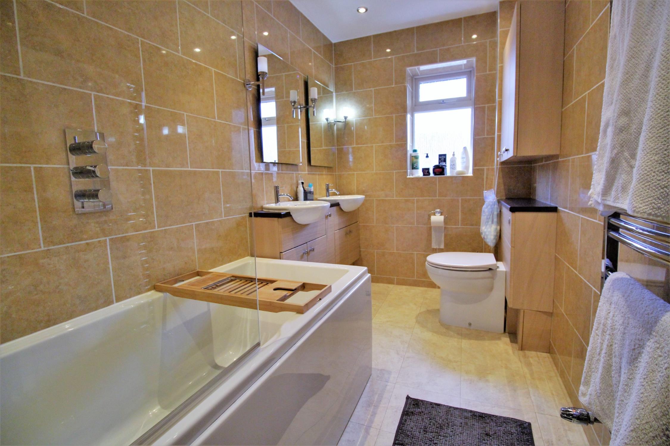Two inset sinks in vanity units, panel enclosed bath with shower over and shower screen, low level wc, heated towel rail, front aspect double glazed obscured window.