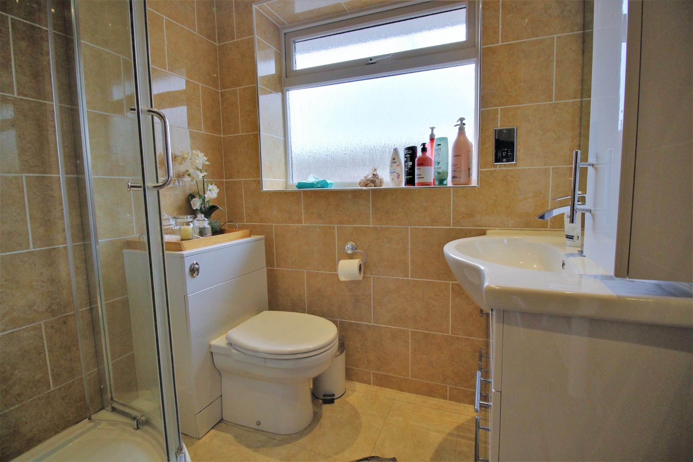 Corner shower cubicle, low level wc, vanity unit, heated towel rail, front aspect double glazed obscured window.