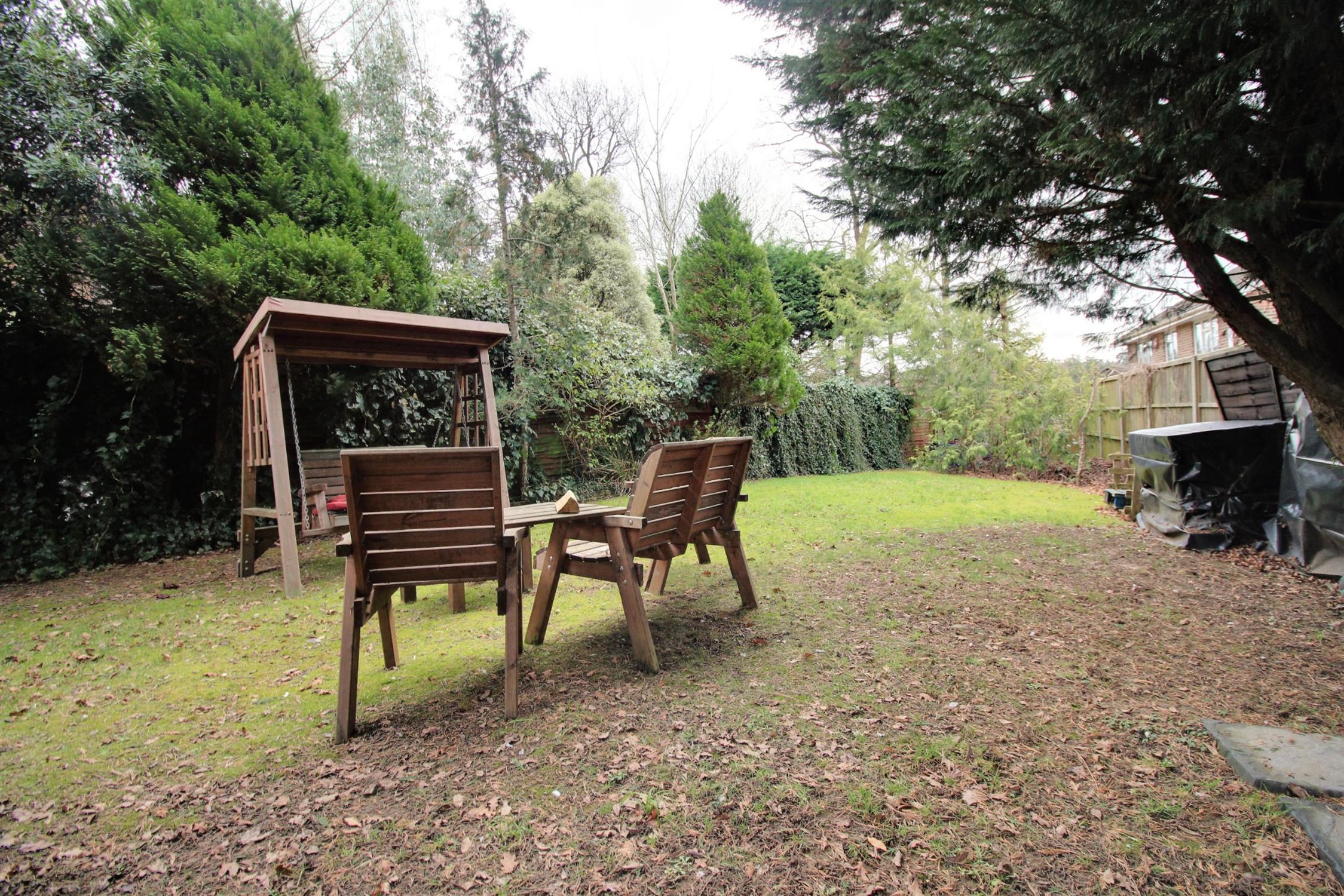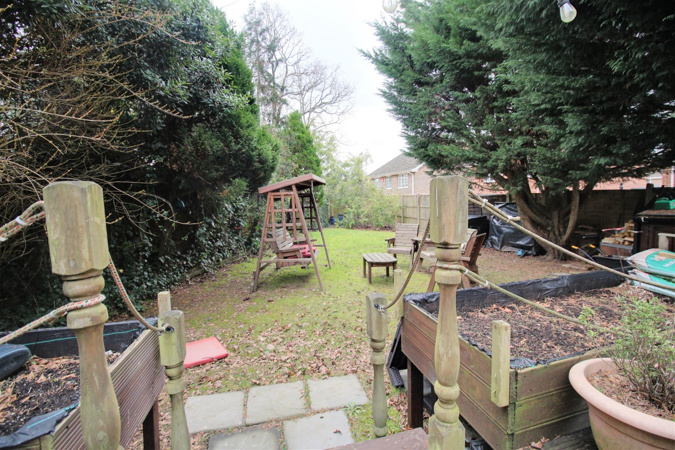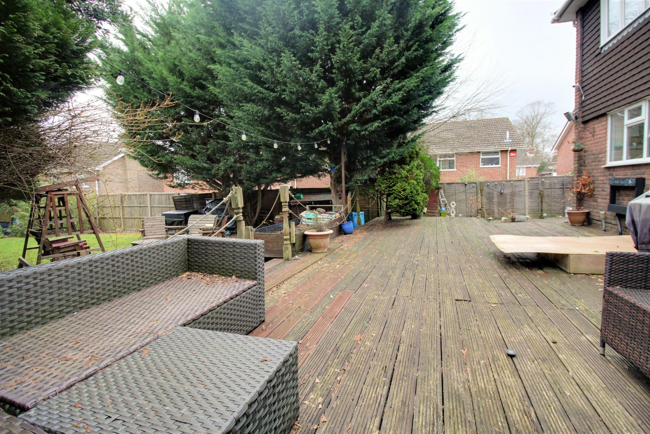 Large raised decking area to the rear, steps down to the lawn with shrubs, trees and borders, side garden with patio, outside tap, enclosed by fence.