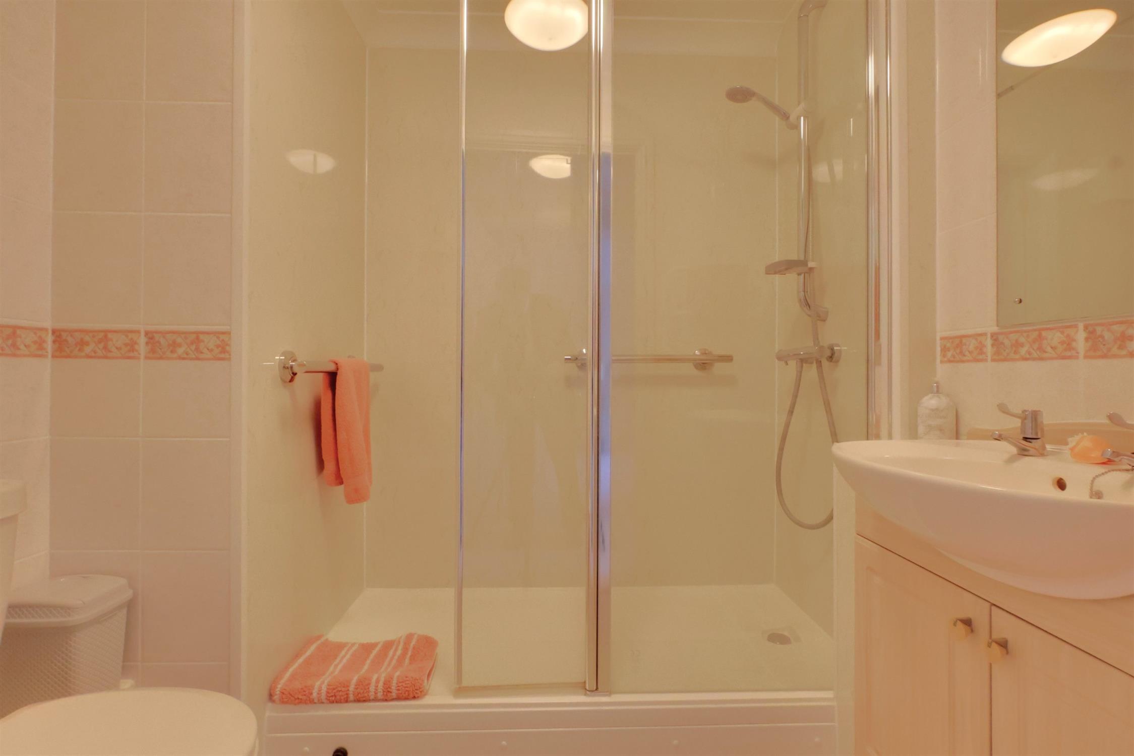 Comprises of a double shower, low-level WC, vanity wash hand basin, extractor fan, heated towel rail, electric wall heater, and tiled walls.