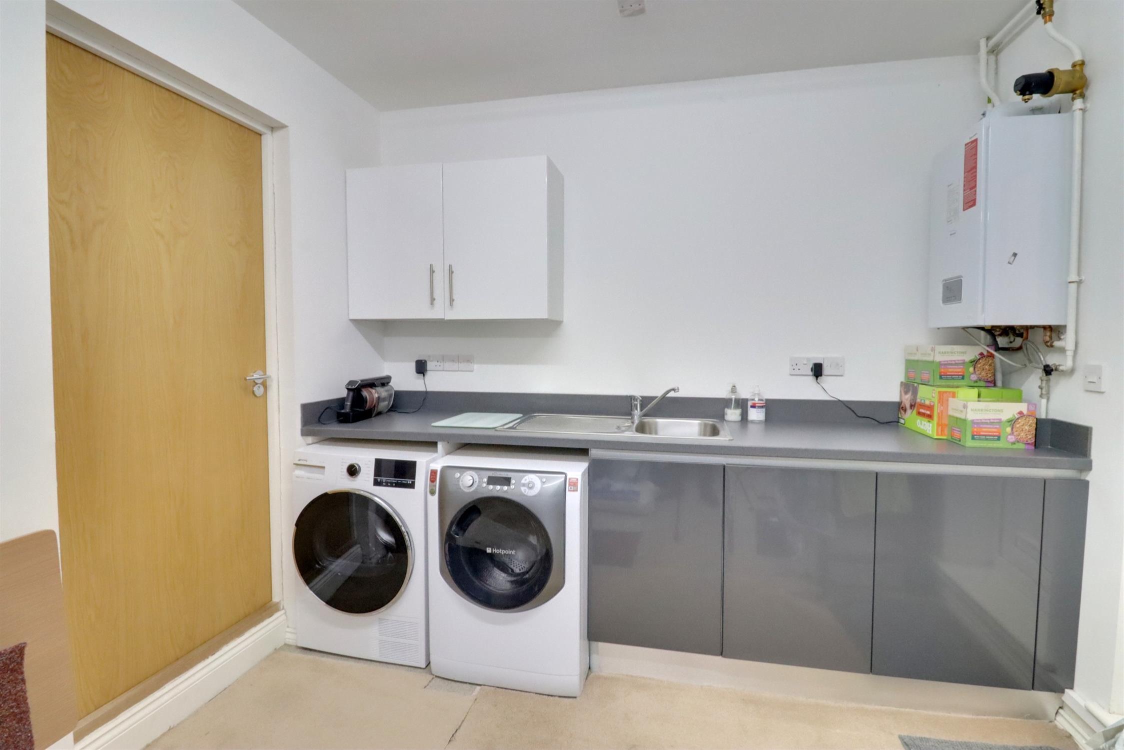 Wall and base units, spaces for washing machine and tumble dryer, inset stainless steel sink and drainer, wall mounted boiler (installed in 2023) light and power, up and over door.