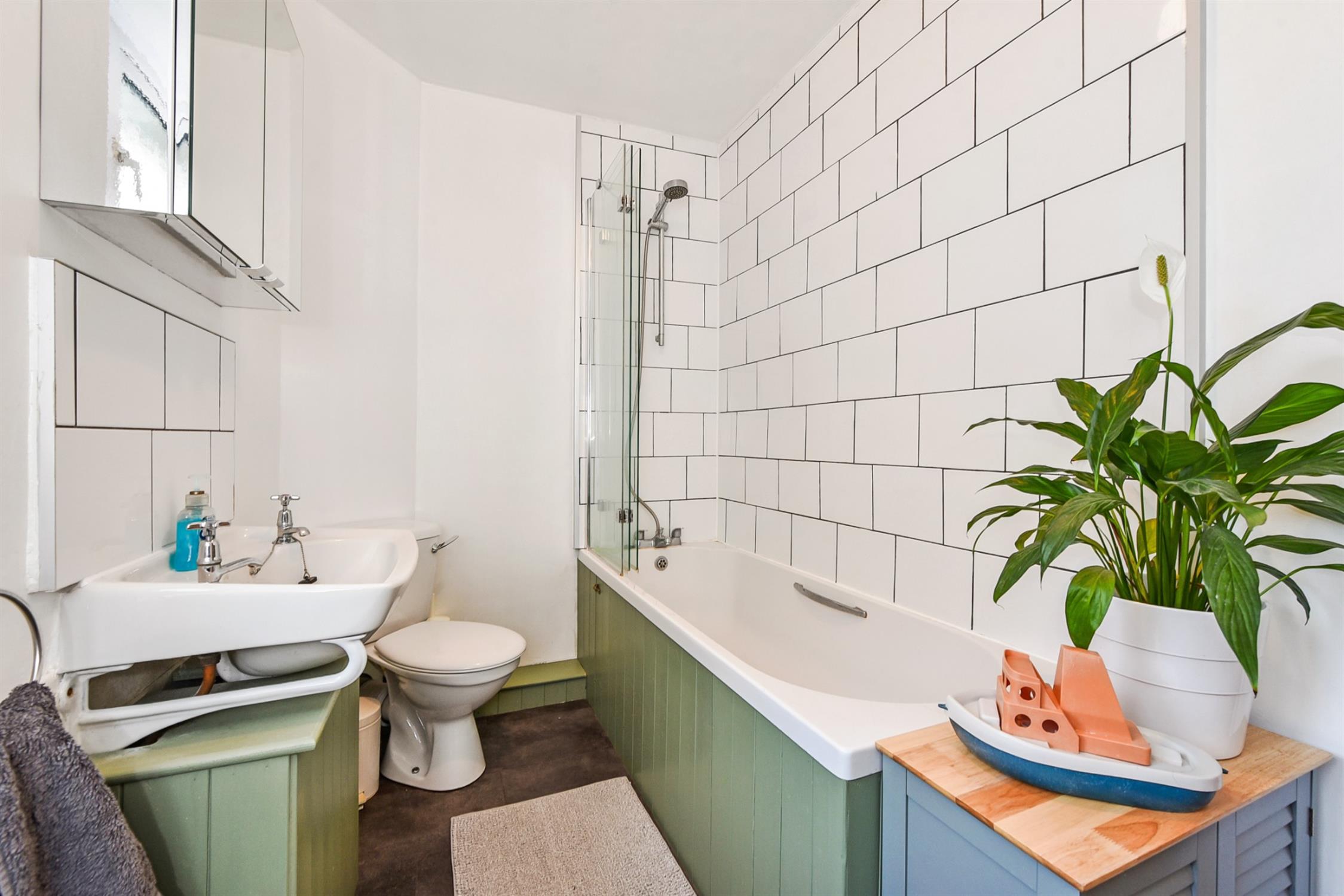 White suite. Bath with shower over, basin and toilet. Heated dual-fuel towel rail.