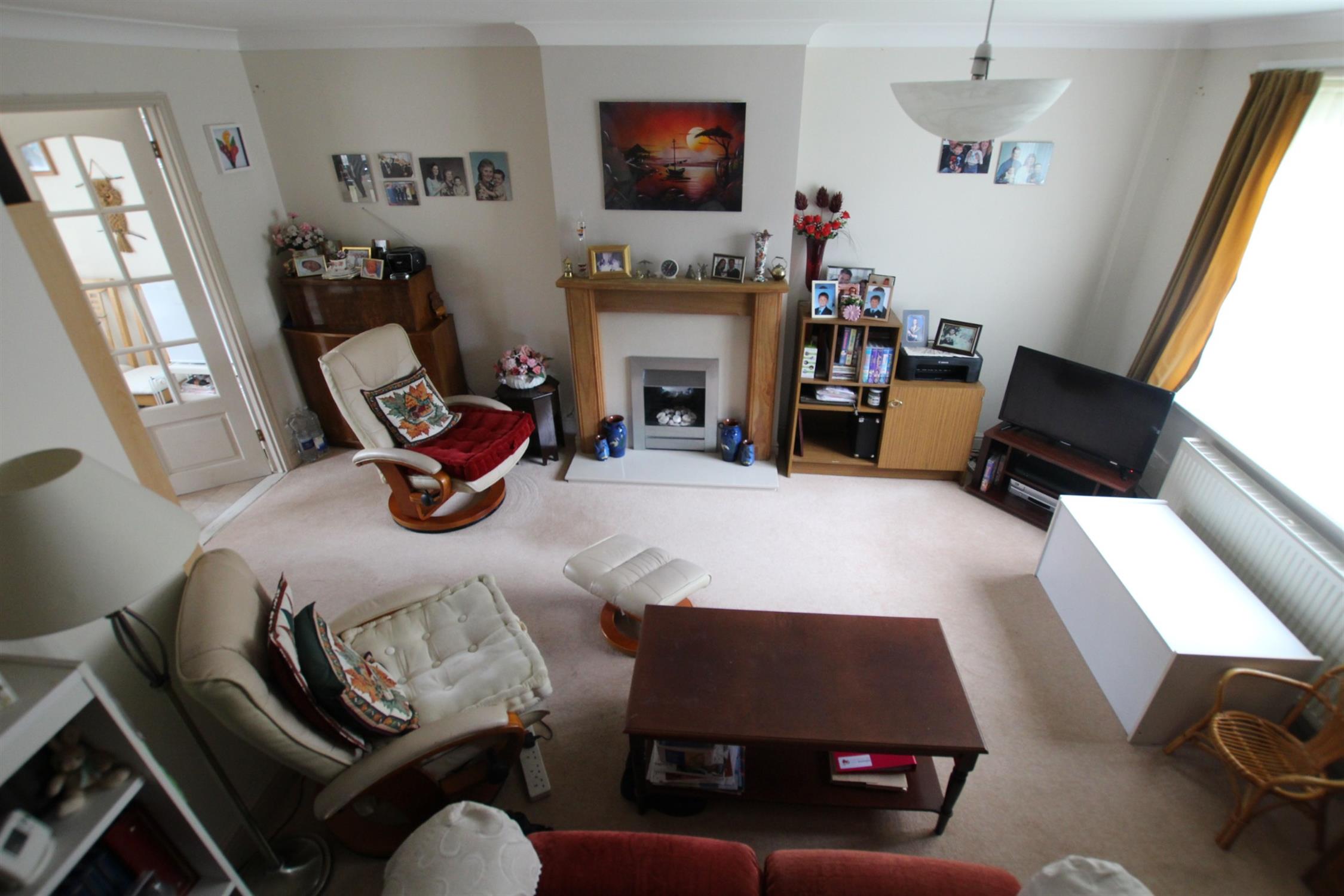 LOUNGE Double glazed window to front elevation, open stairs to first floor with feature bannisters, central modern gas fire with marble hearth and wooden surrounds, double radiator, TV, telephone and power points, skimmed ceiling, french doors to