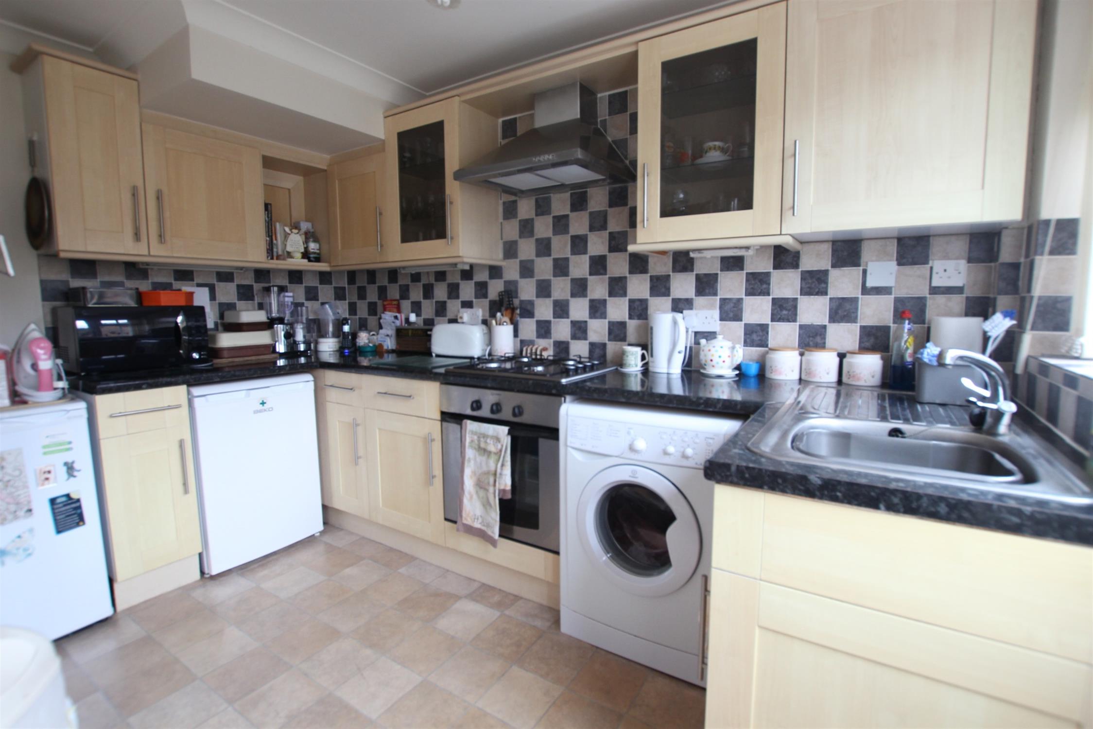 KITCHEN/DINER Double glazed windows and obscured double-glazed door to rear elevation and garden. Modern fitted kitchen offers wall and base units with under unit lighting, roll edge work surfaces and tiled surrounds, integrated electric oven with four ring gas hob and extractor fan-over, inset sink and drainer with mixer taps, space and plumbing for washing machine, space for fridge/freezer, open plan to dining area with space for table and chairs, double radiator, power points, skimmed ceiling.