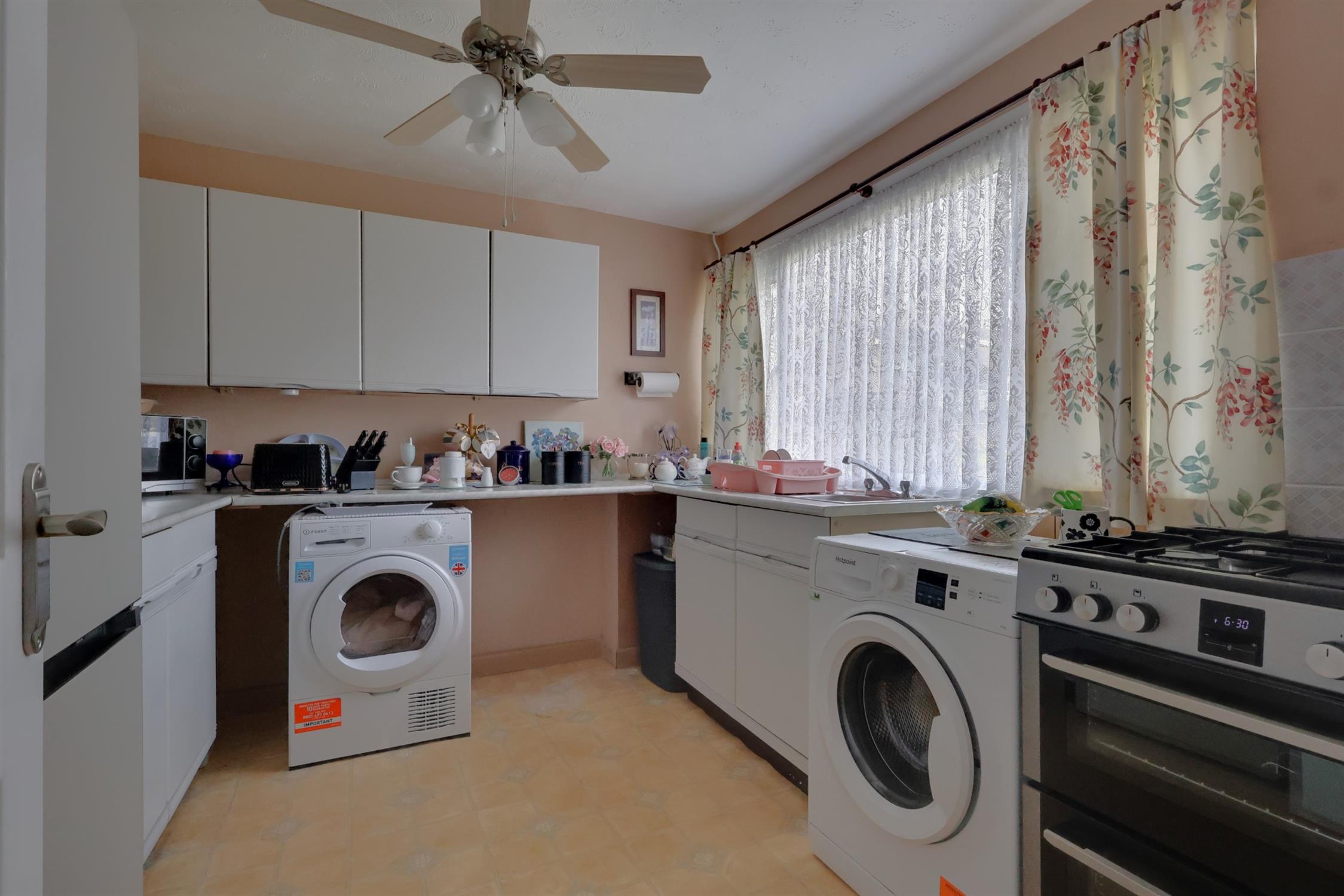 Features a double-glazed window to the front elevation, a range of wall-mounted units, and rolled-top work surfaces. It includes a stainless steel sink with a mixer tap, and space for a cooker, washing machine, tumble dryer, and fridge-freezer. A serving hatch connects to the lounge, and the room has part-tiled walls and a radiator.
