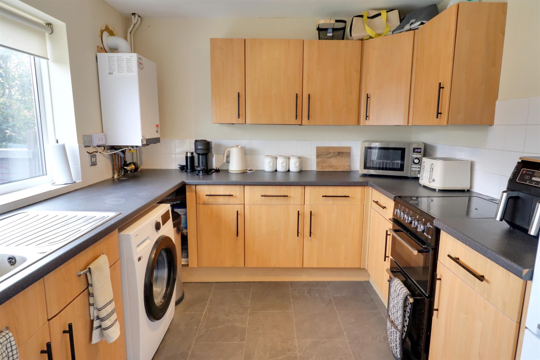 KITCHEN - Double glazed windows to the rear aspect. Matching wall and base units with contrasting worktops. Inset stainless steel sink and drainer. Tiled splashback. Freestanding electric stove. Space and plumbing for washing machine and condensing tumble dryer.