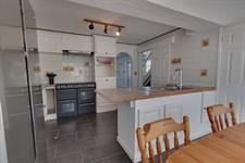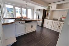 Range of fitted floor and wall units with contrasting work surfaces and complimentary wall tiling. Peninsular base unit with stainless steel sink. Range style cooker with extractor hood. Radiator. French style double glazed Upvc doors to Sun Lounge.
